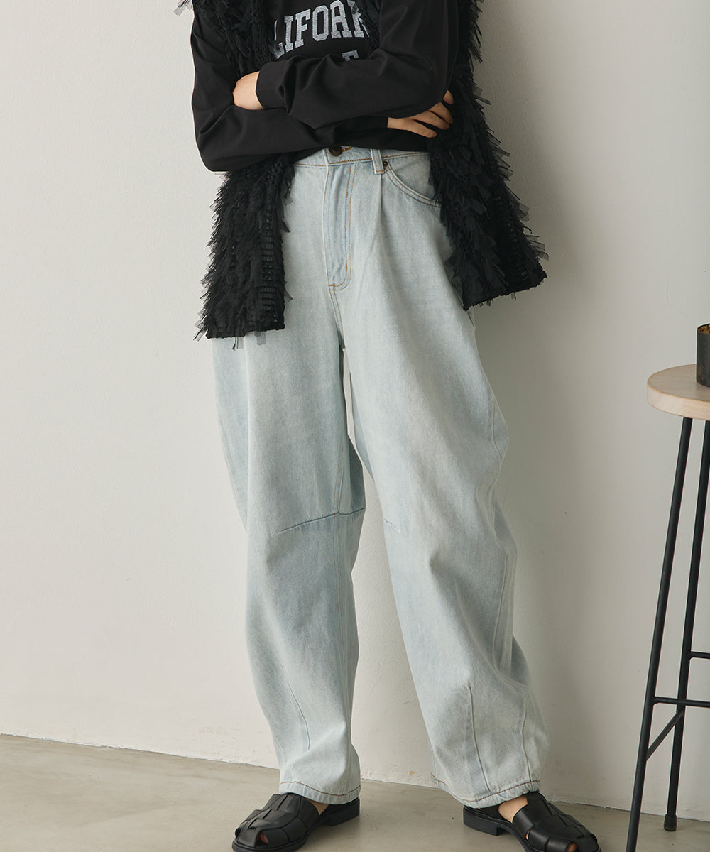 裾に向かってカーブを描く独特のラインが美しく、ゆったりとした穿き心地ながらシルエットは洗練された印象に。