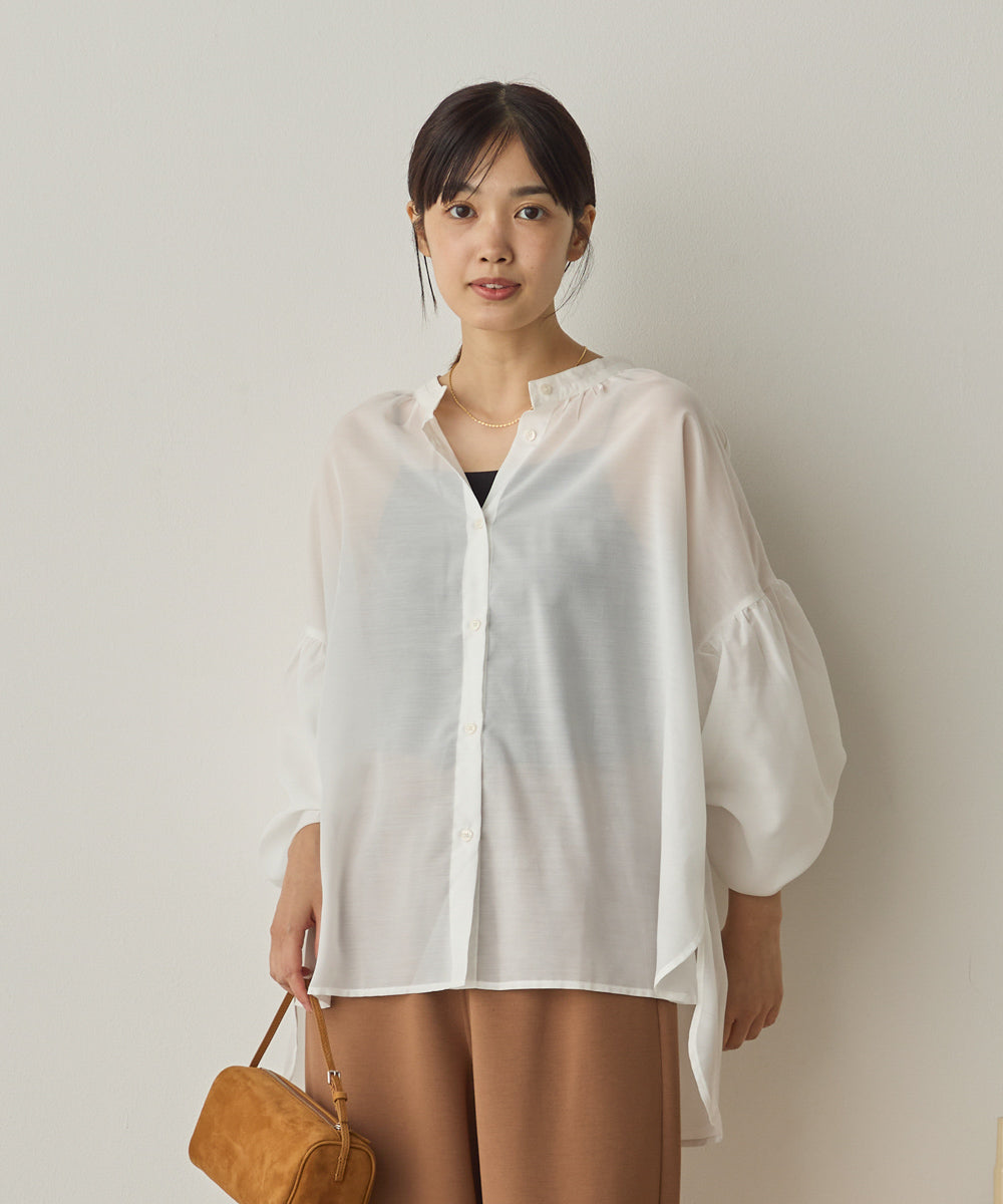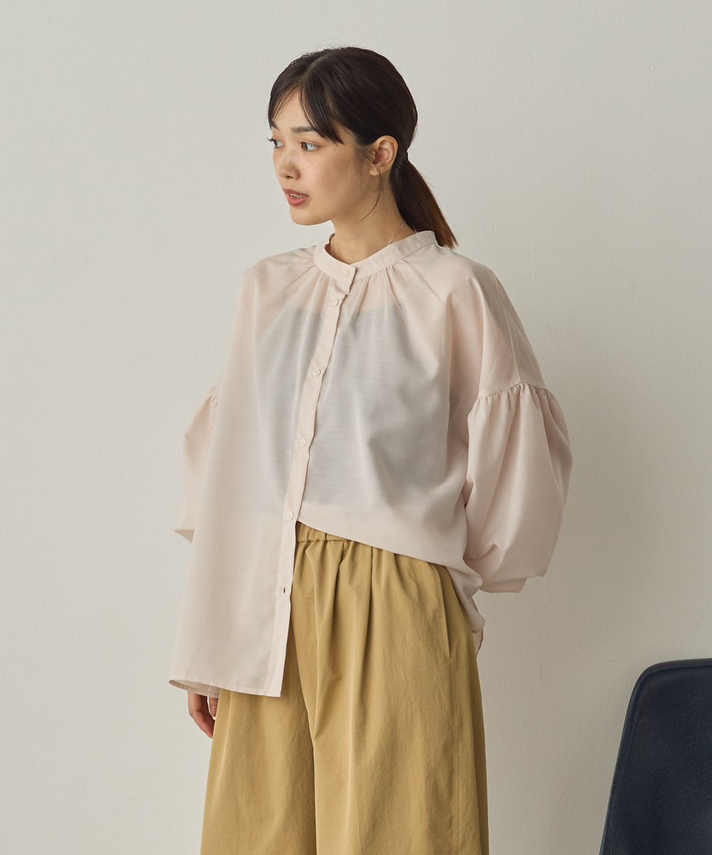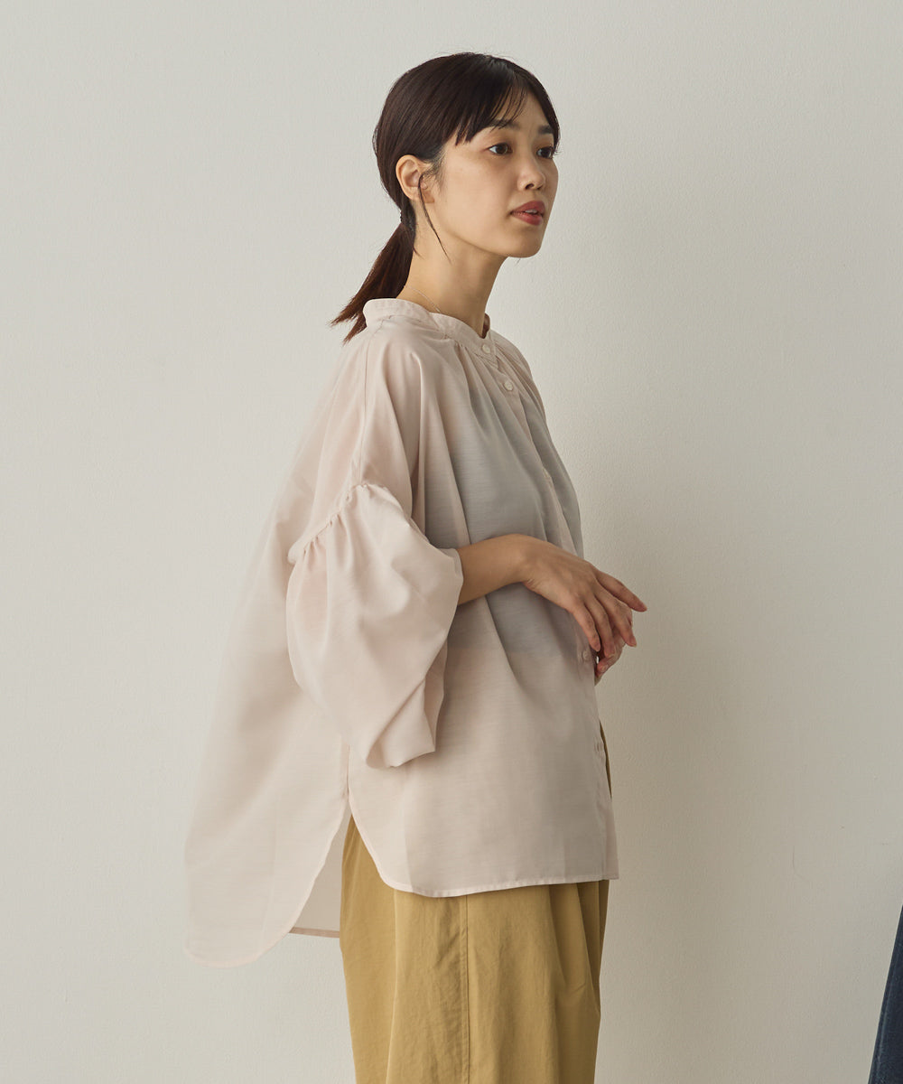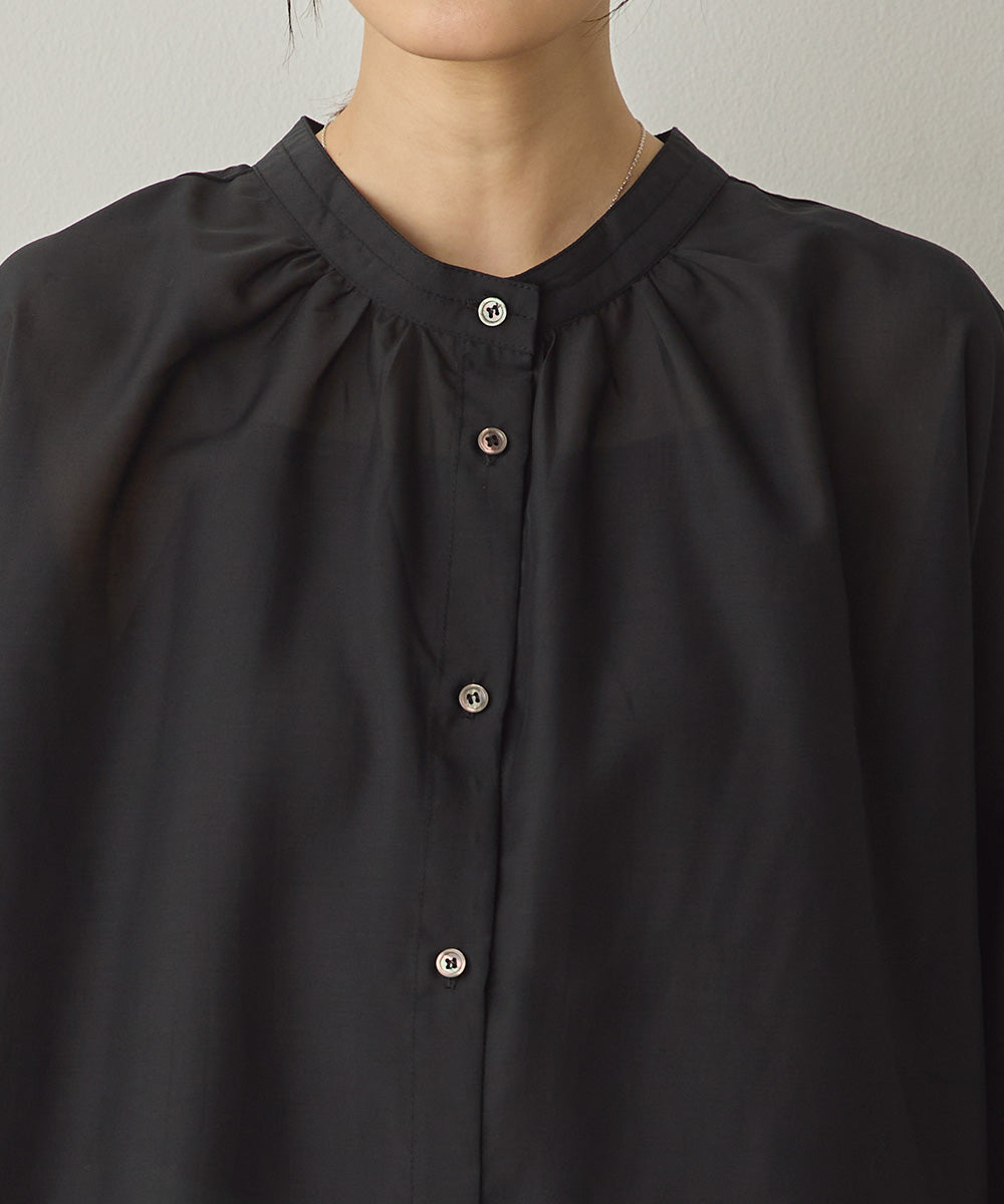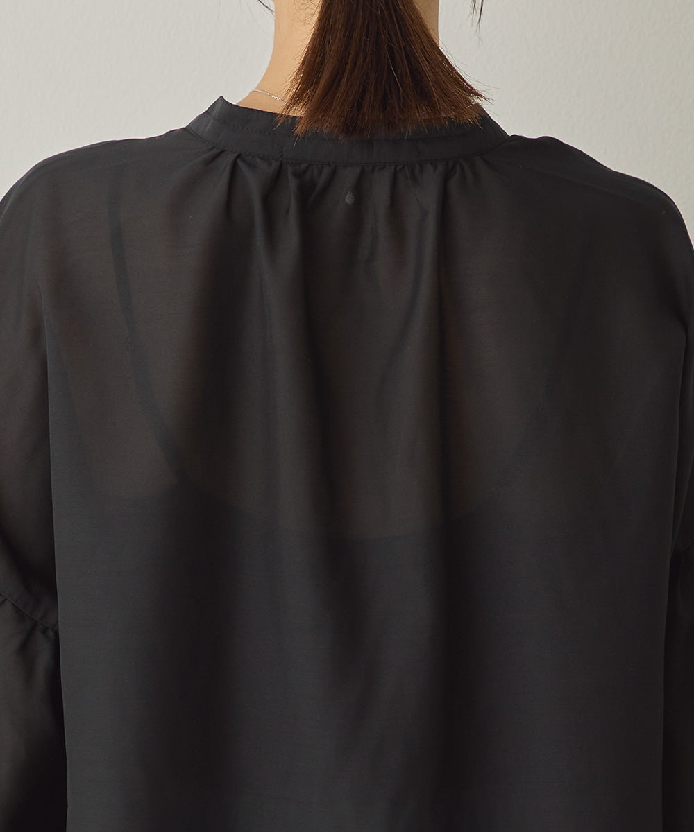 軽やかなシアー素材を使用したバンドカラーシャツ。