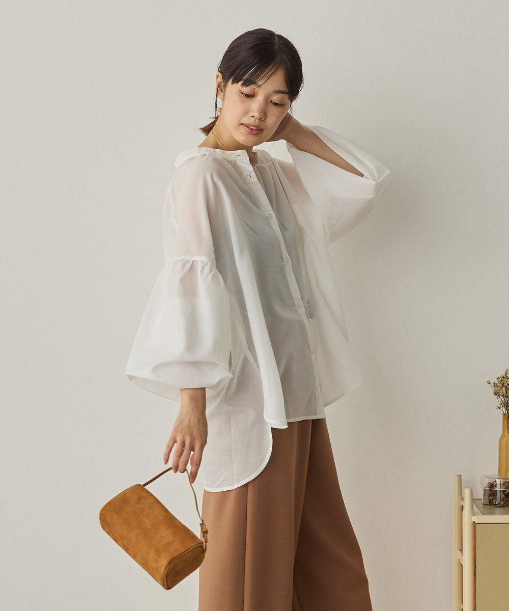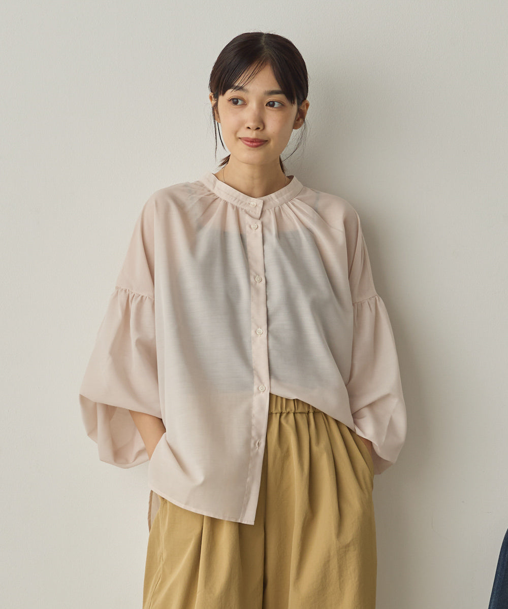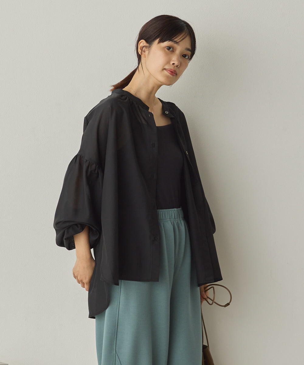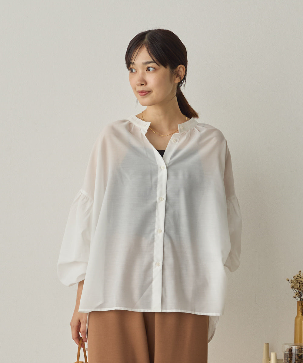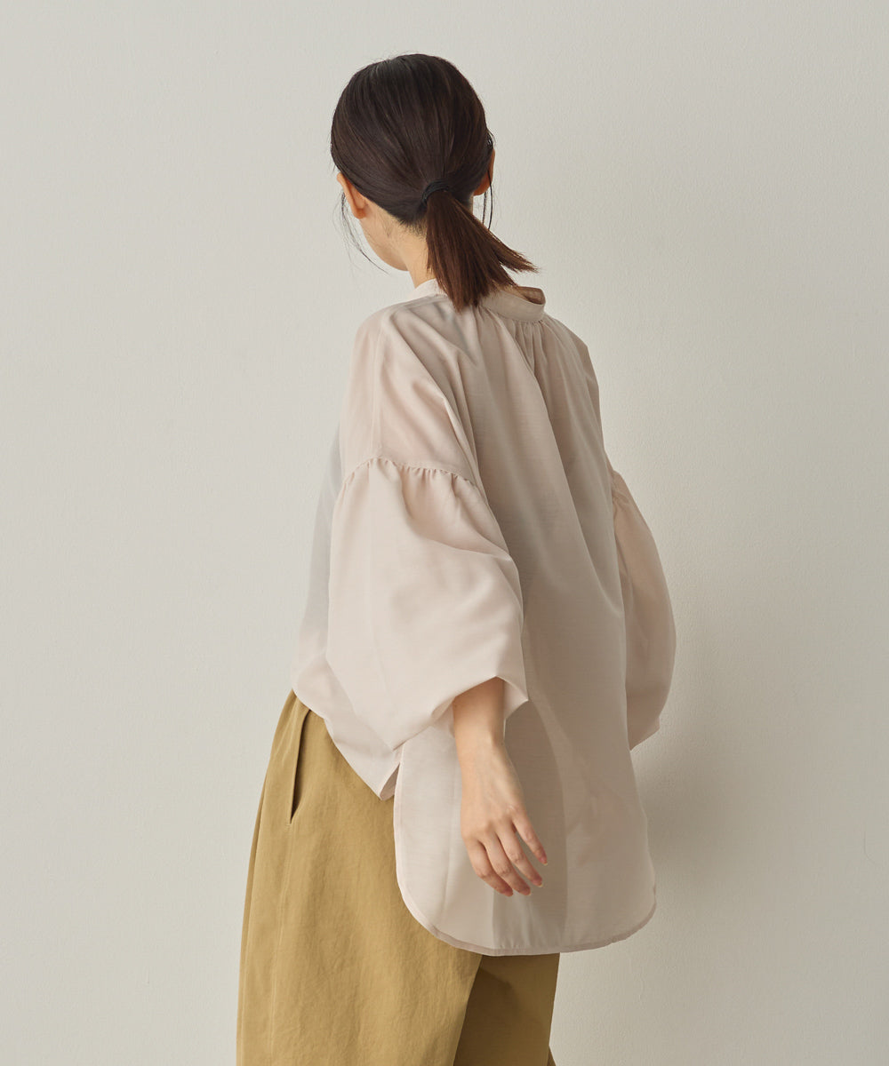 軽やかなシアー素材を使用したバンドカラーシャツ。