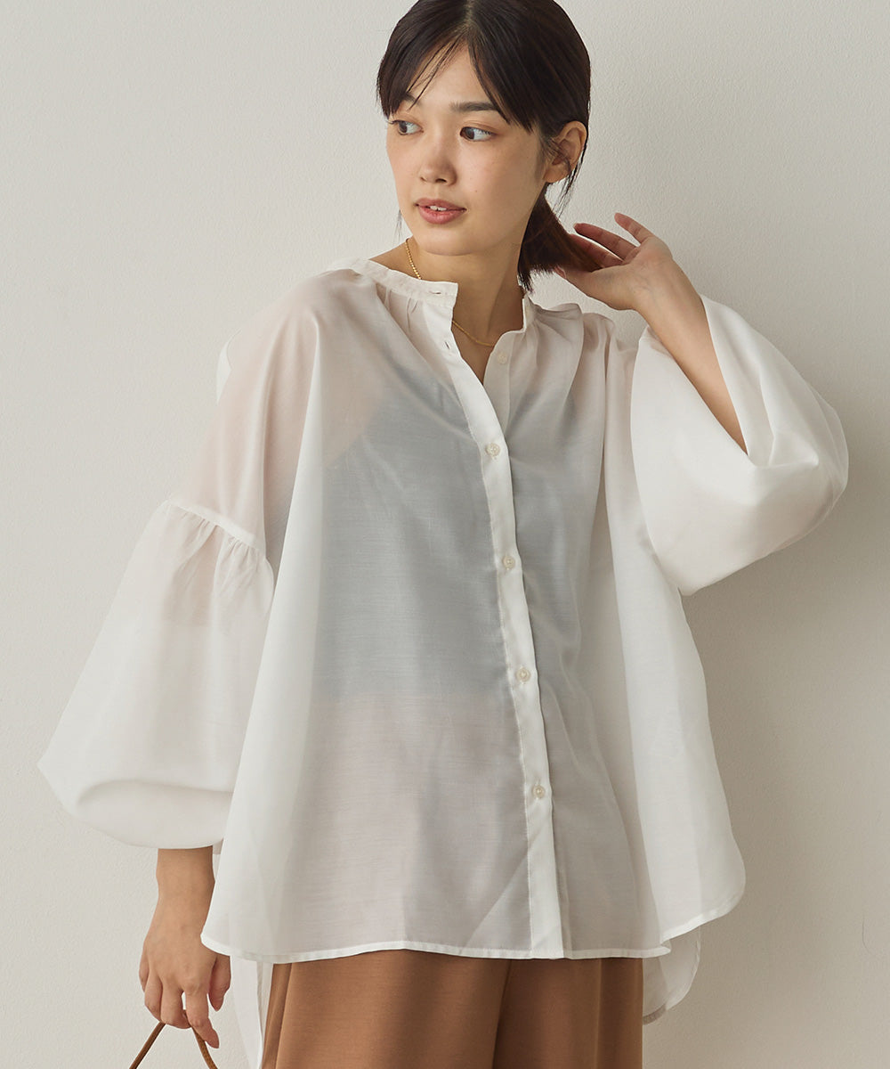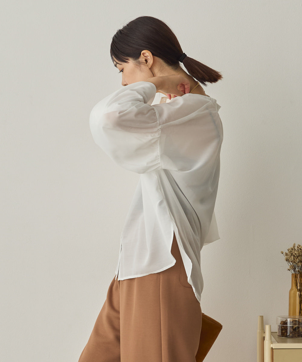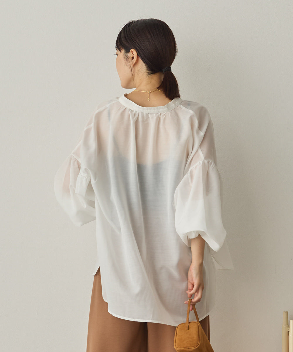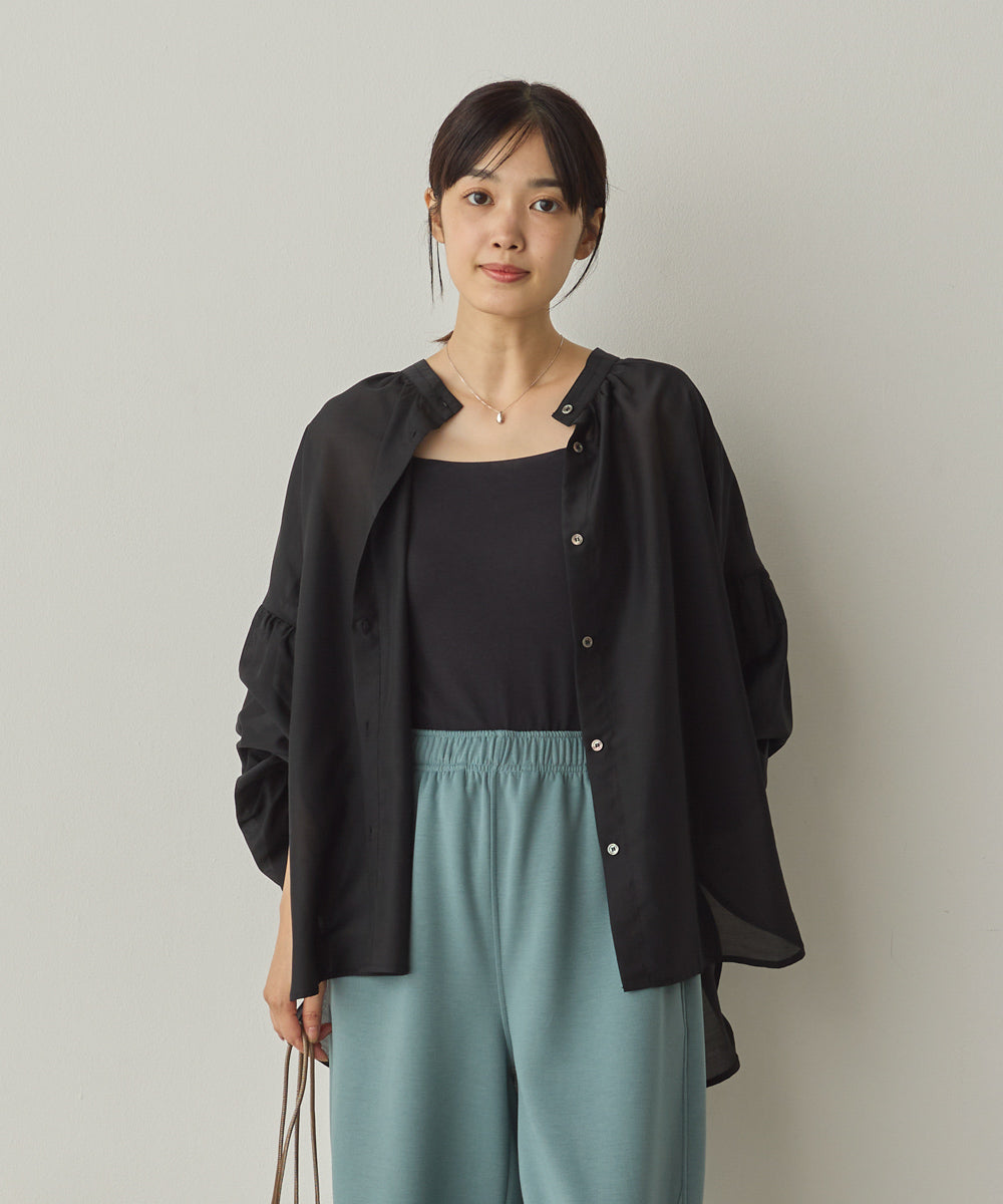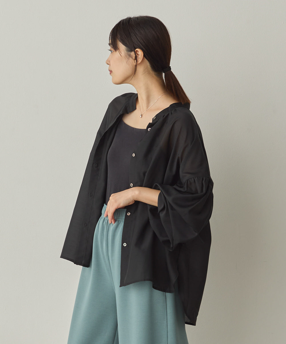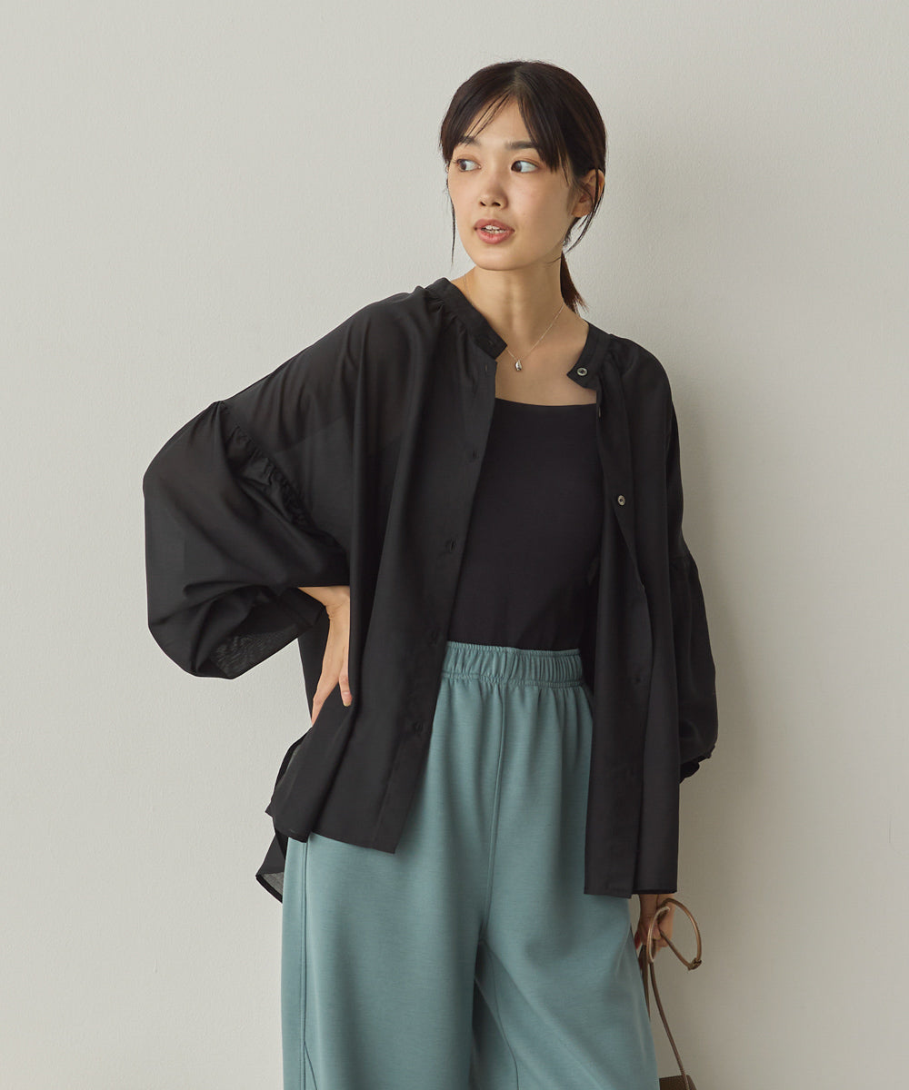 軽やかなシアー素材を使用したバンドカラーシャツ。