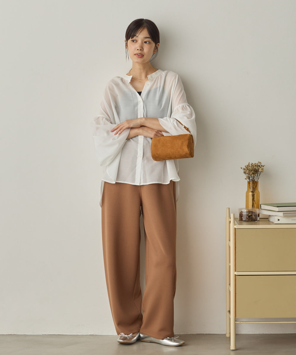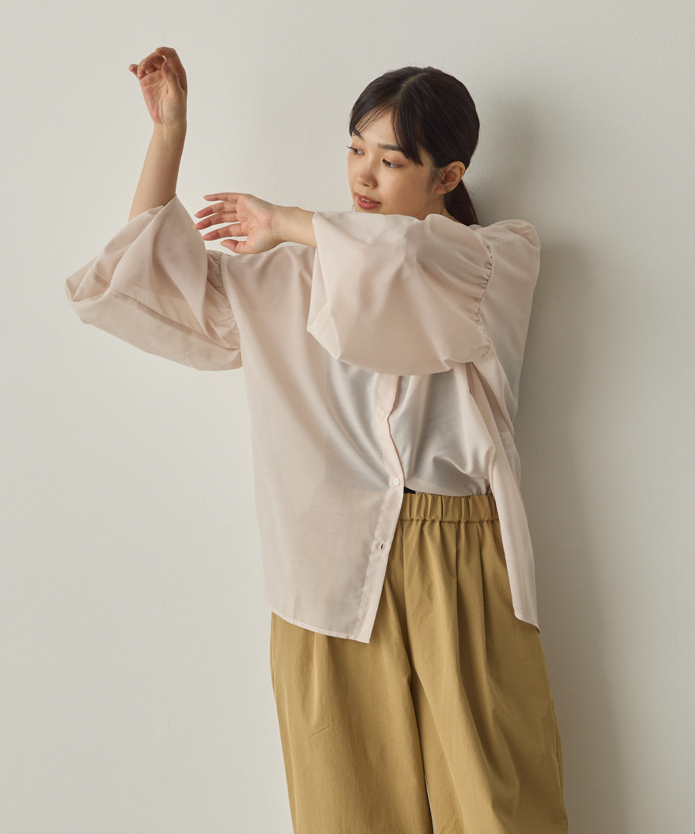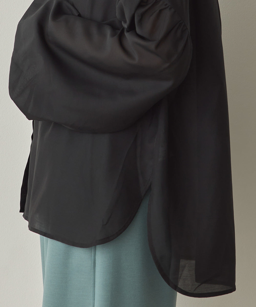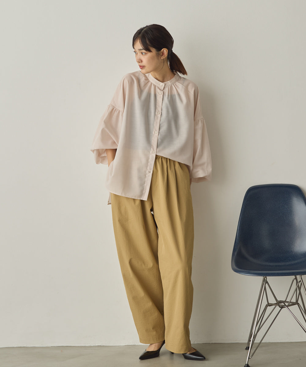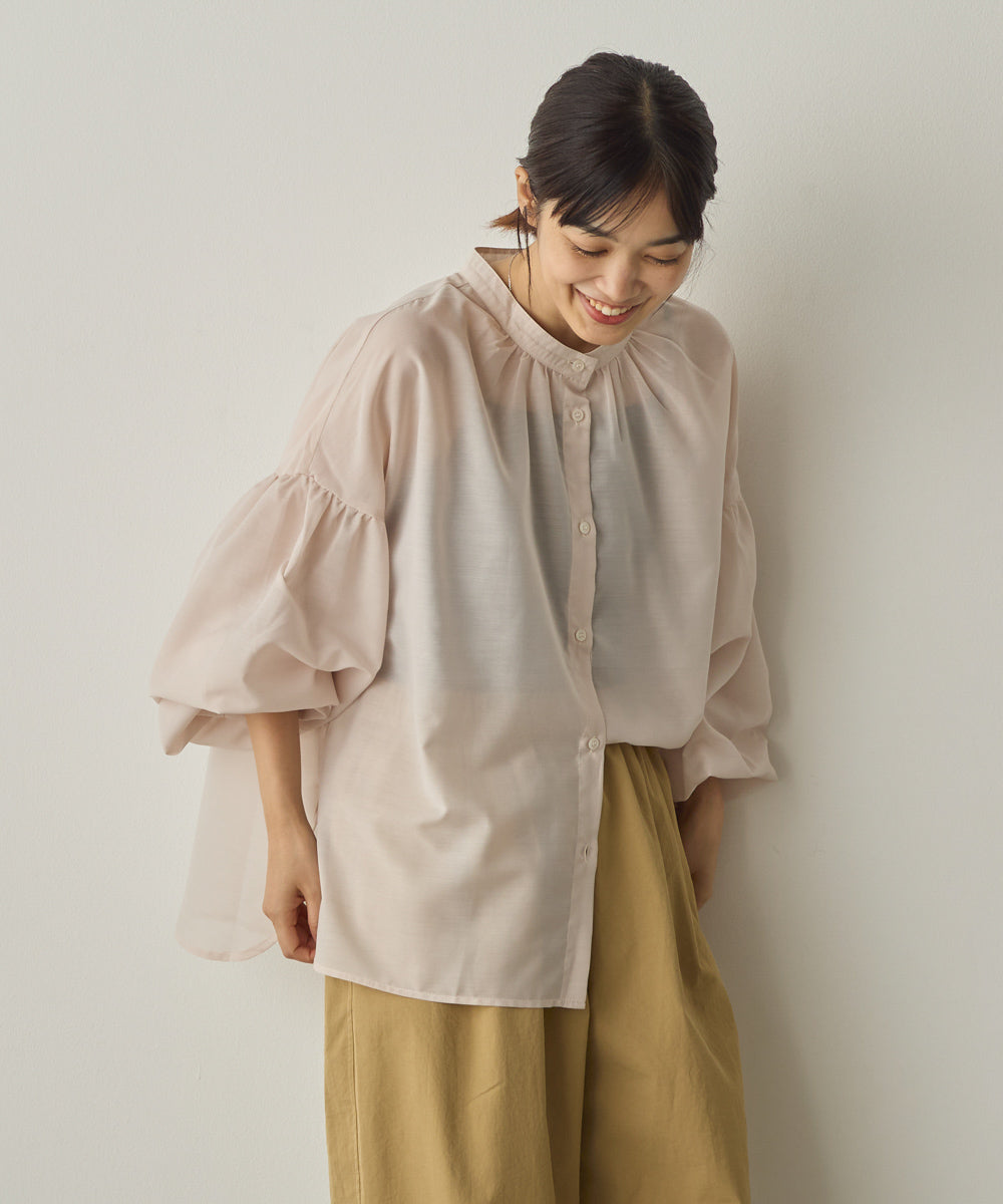 軽やかなシアー素材を使用したバンドカラーシャツ。