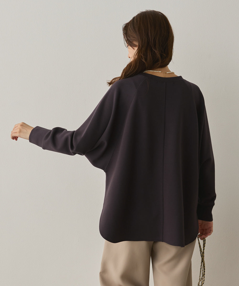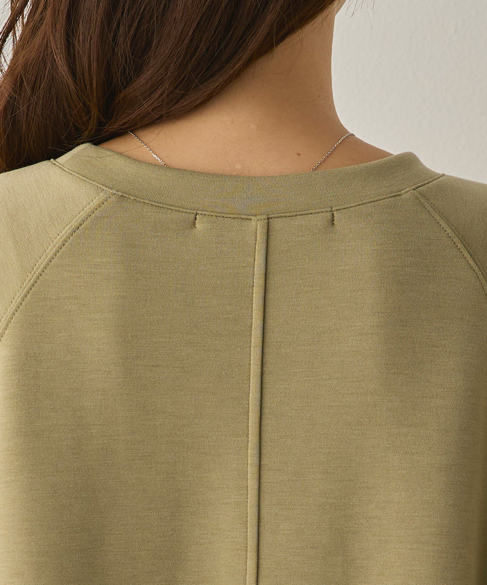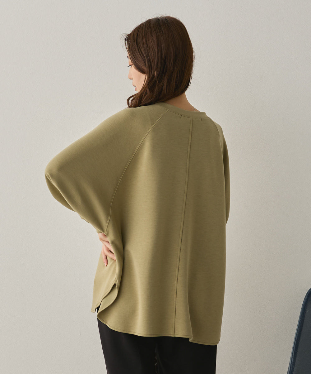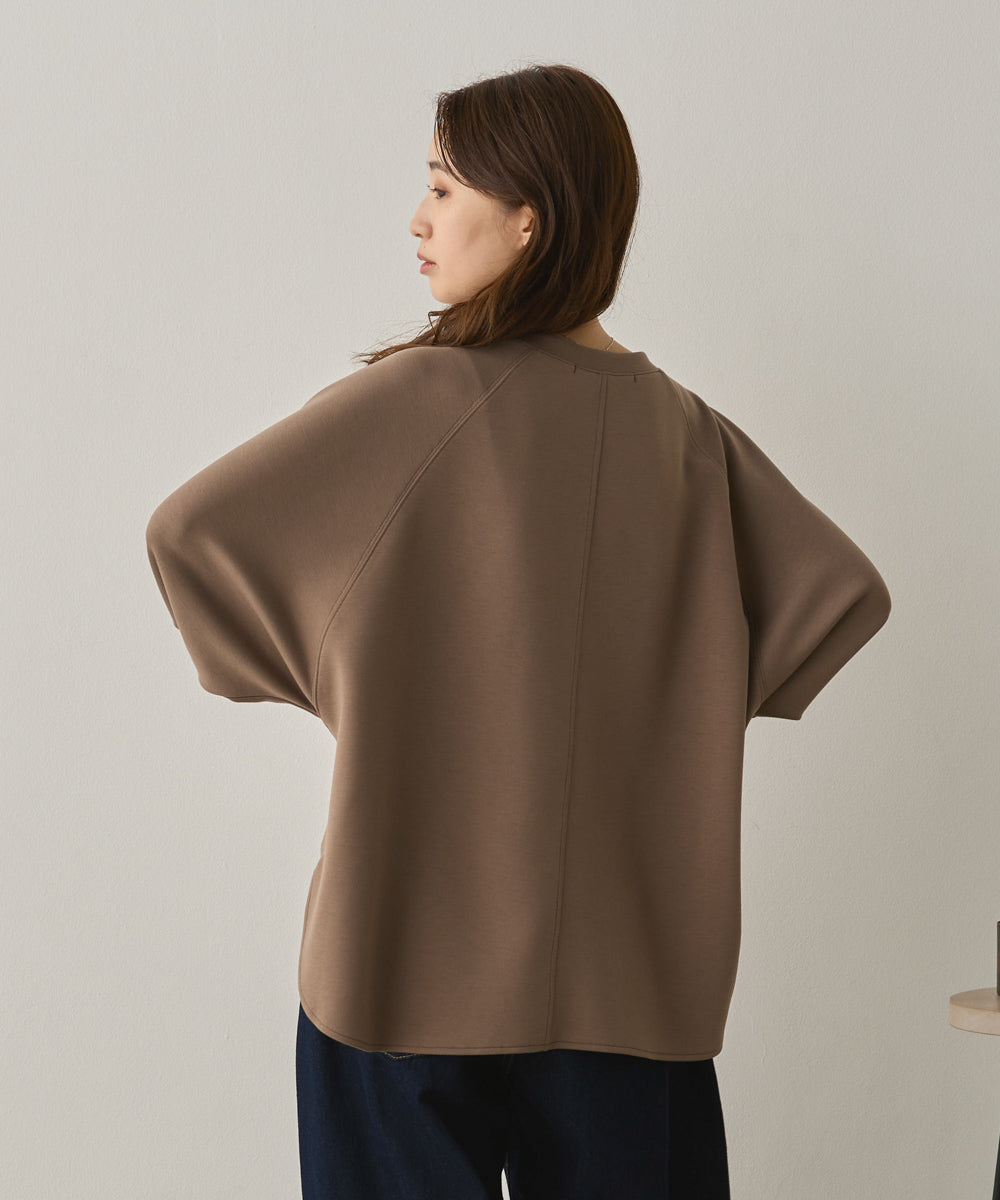 ラグランスリーブで肩まわりが動かしやすく、ゆったりした着心地ながらすっきりとした印象に。