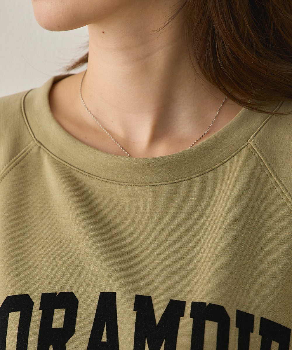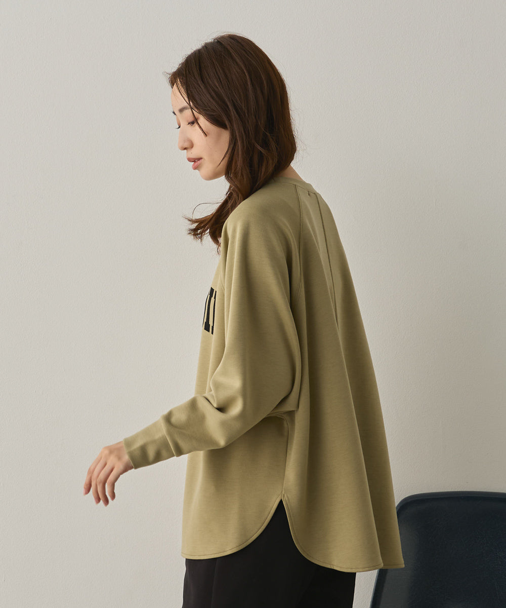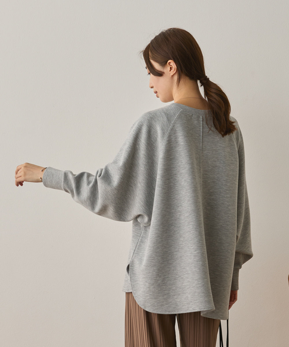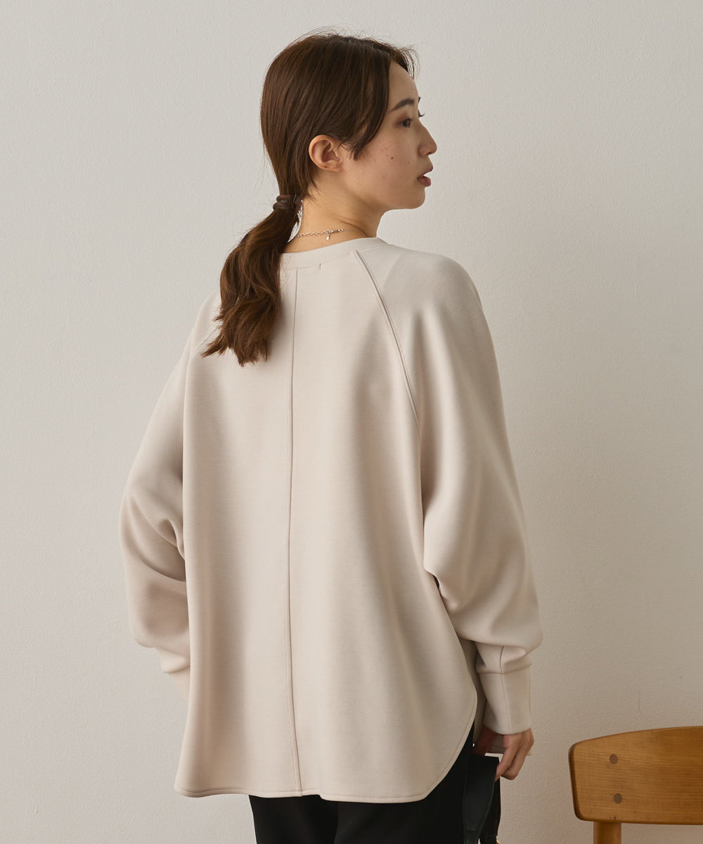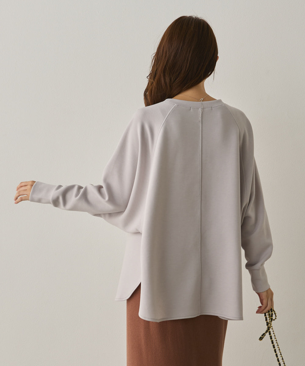 ラグランスリーブで肩まわりが動かしやすく、ゆったりした着心地ながらすっきりとした印象に。