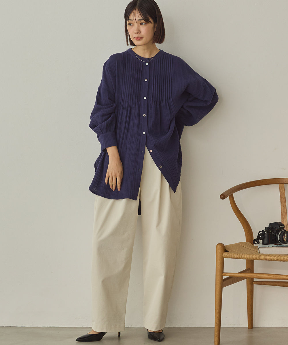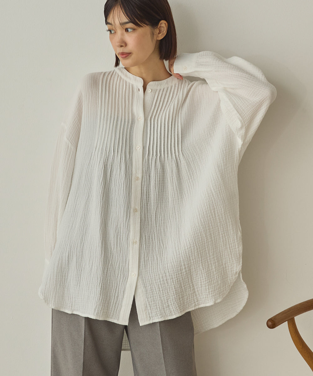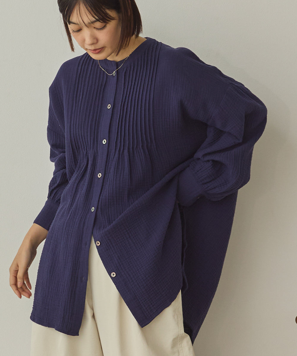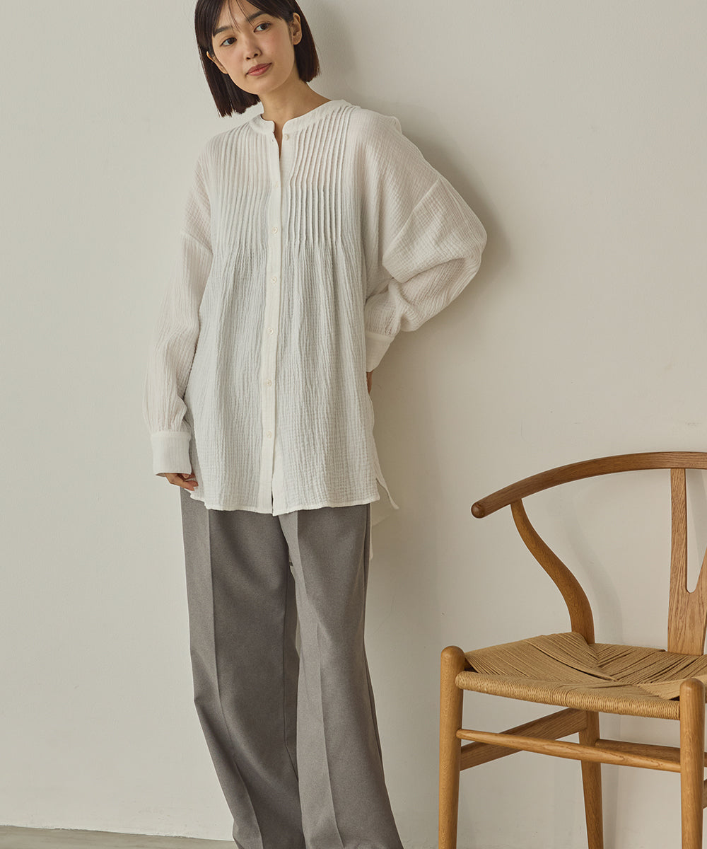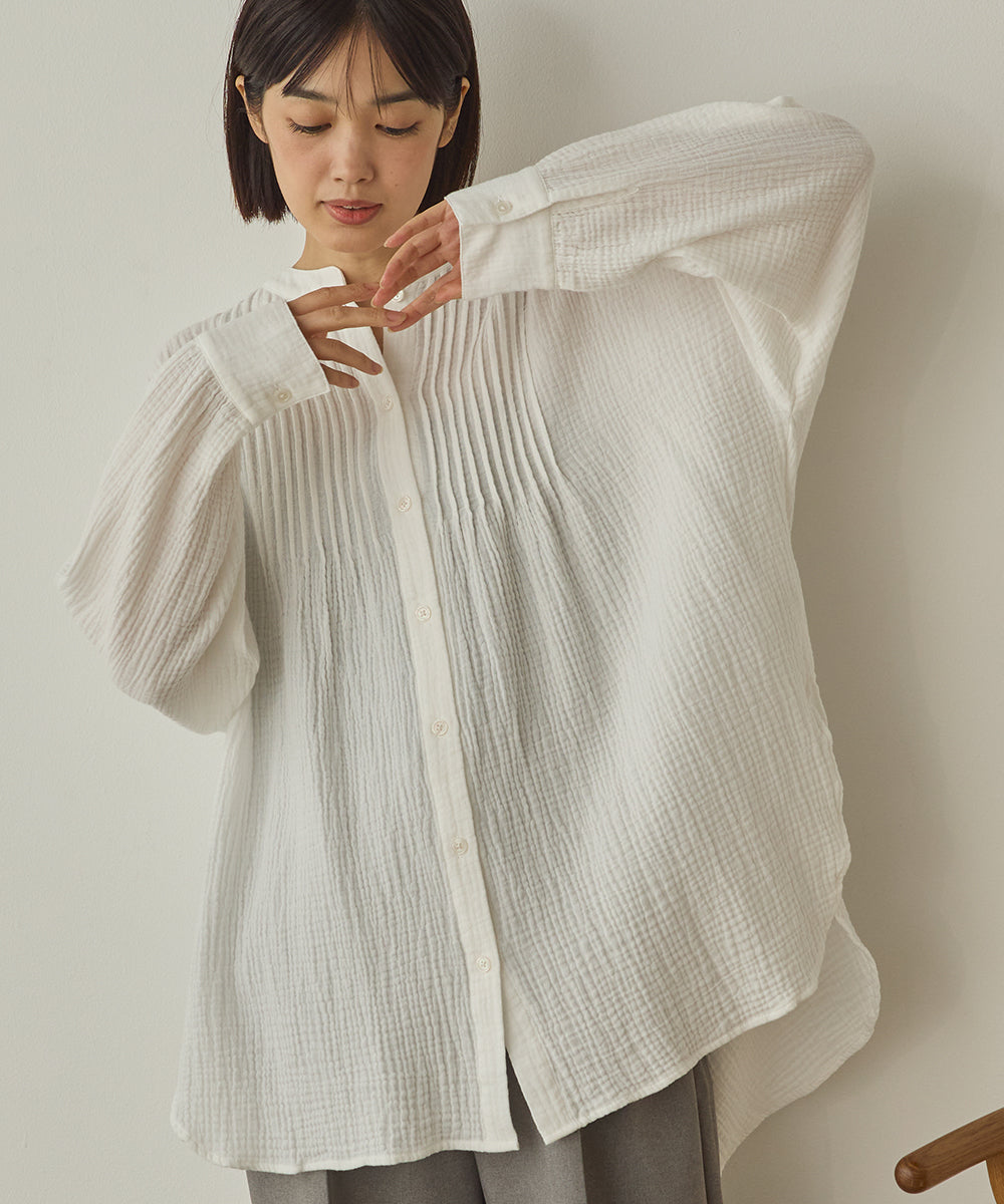 洗い加工を施したダブルガーゼ生地を使用し、柔らかな肌触りとナチュラルな風合いが 魅力のタックシャツ。