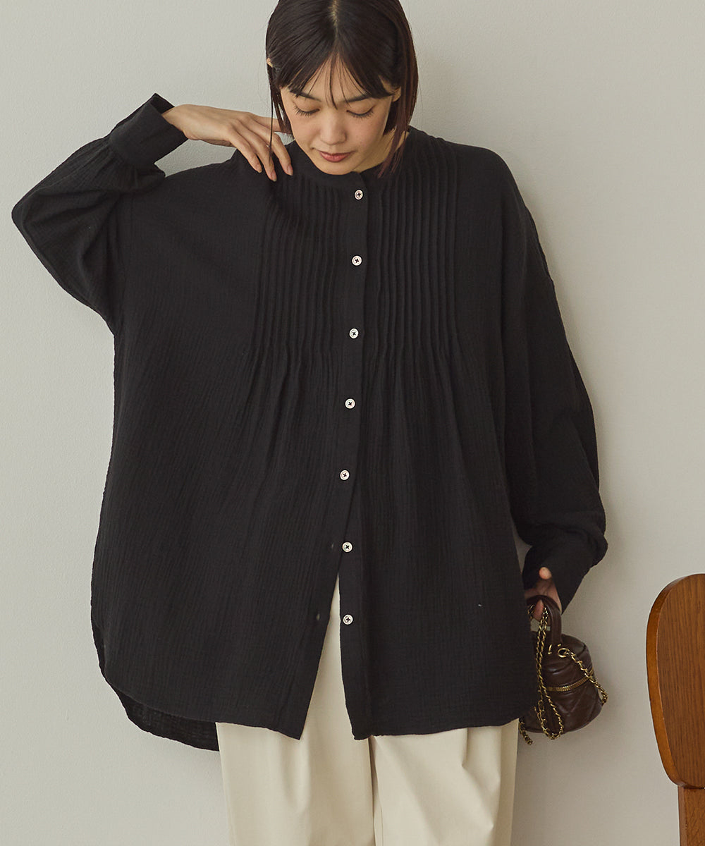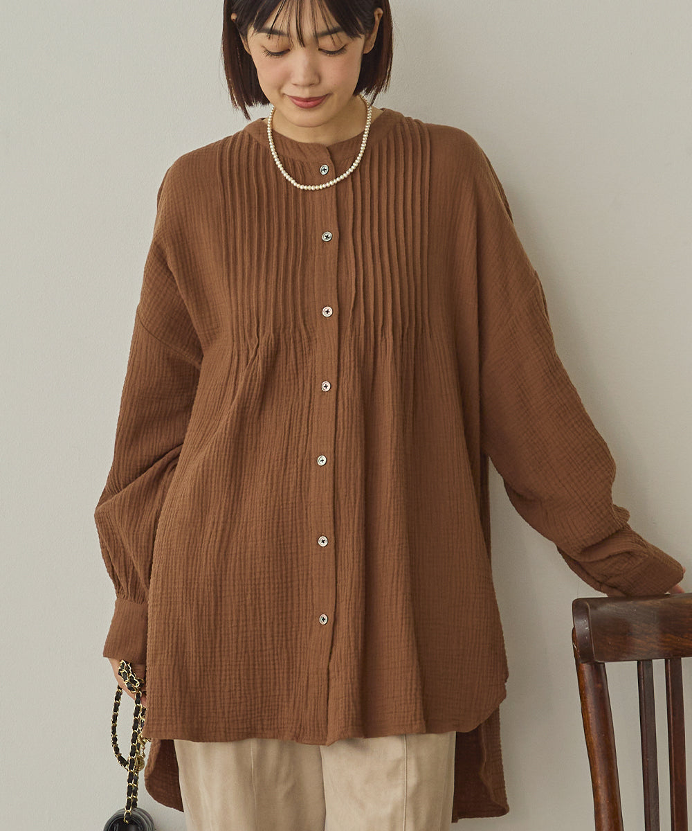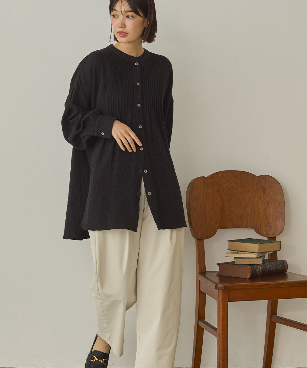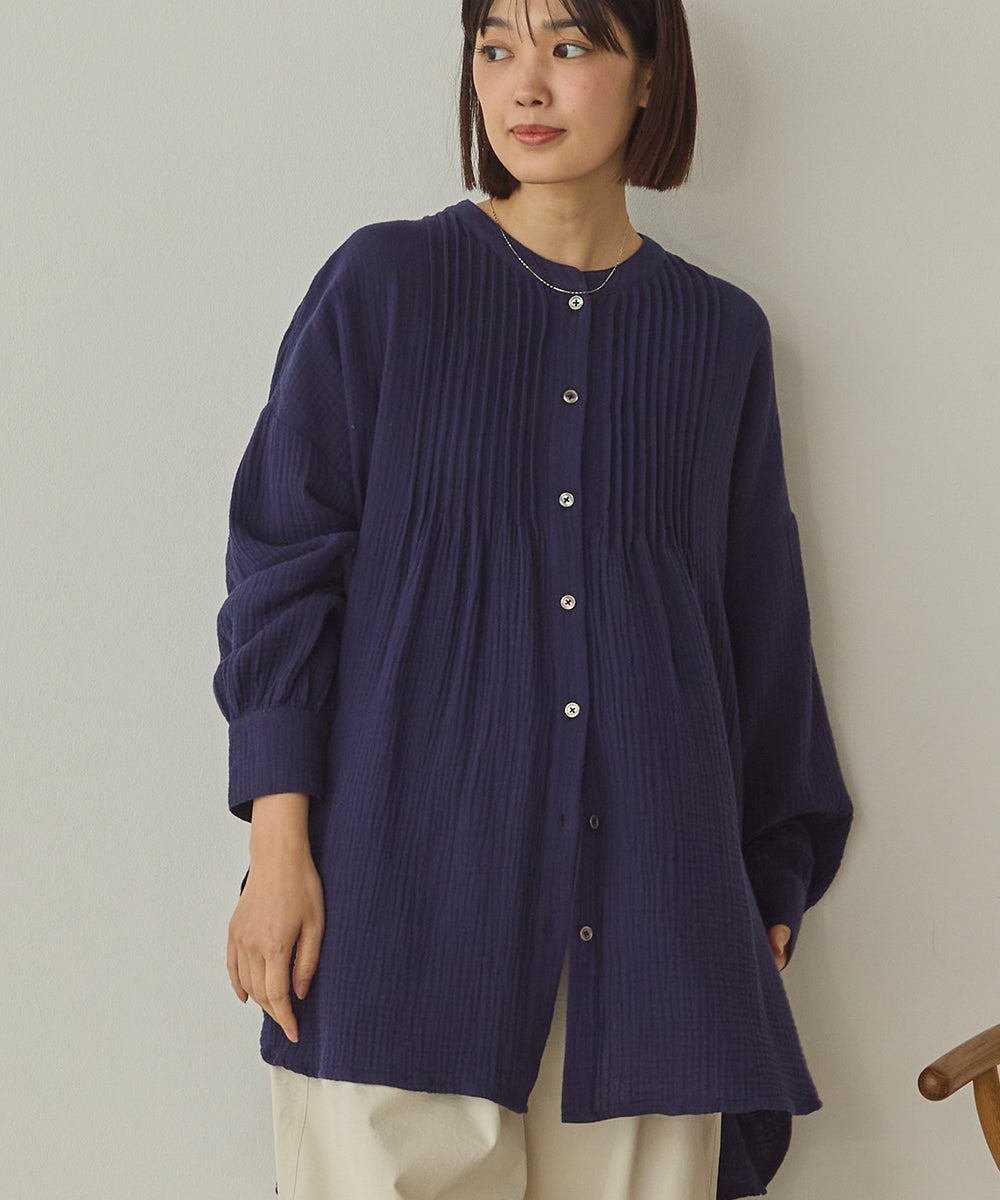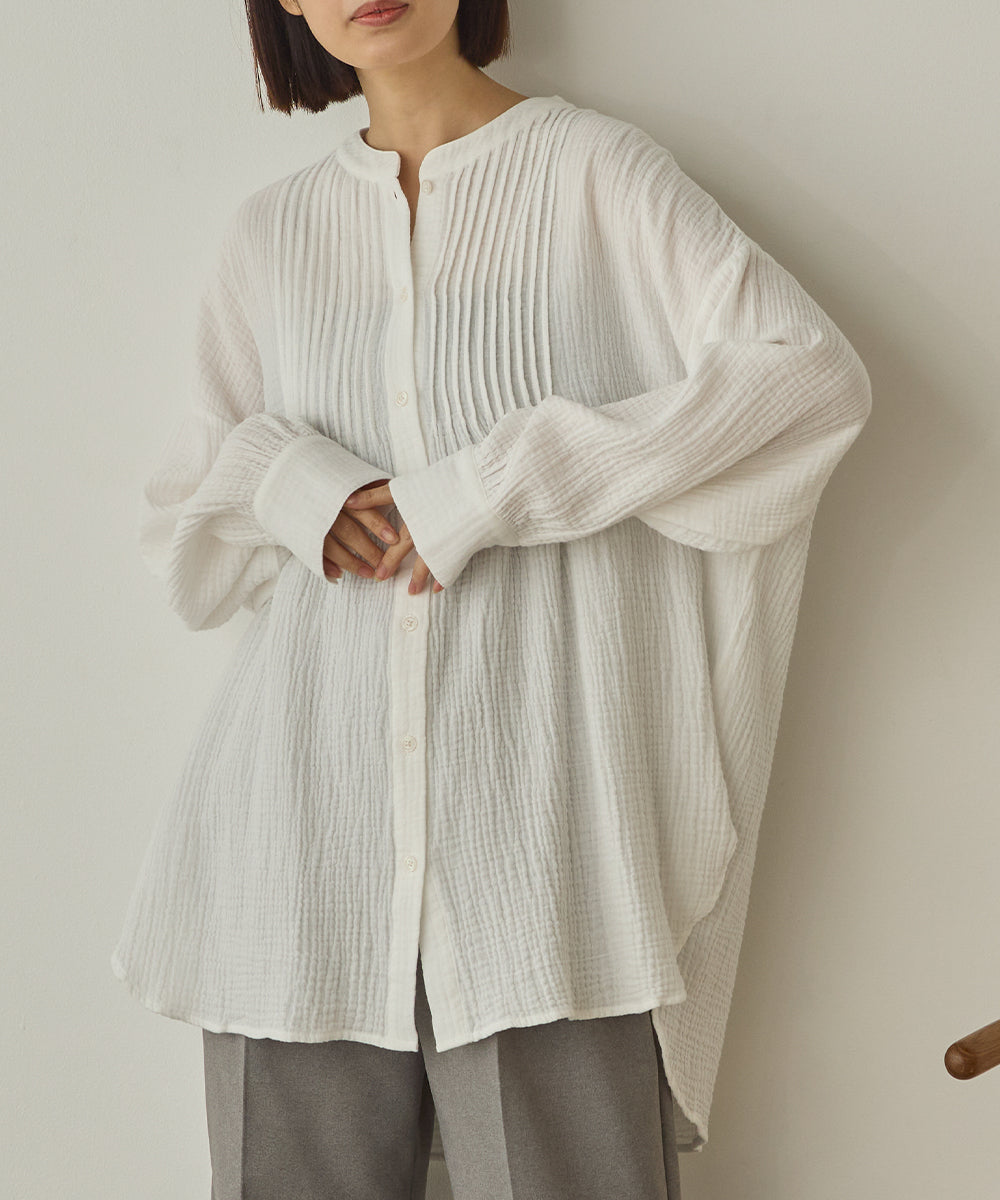 洗い加工を施したダブルガーゼ生地を使用し、柔らかな肌触りとナチュラルな風合いが 魅力のタックシャツ。
