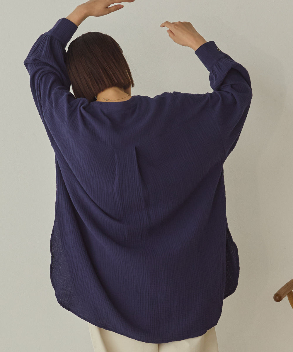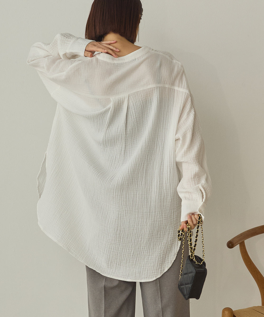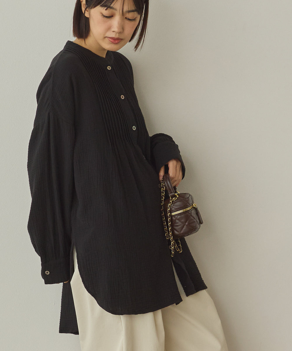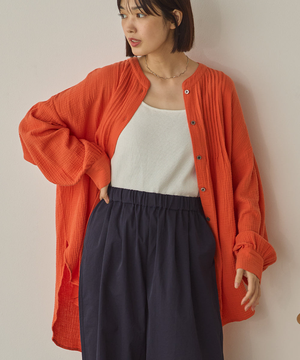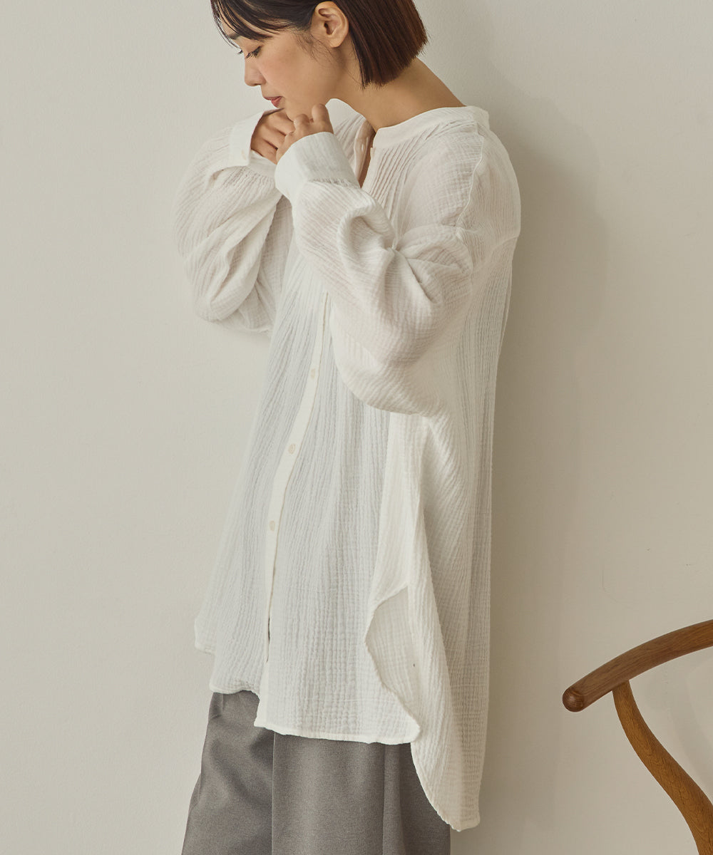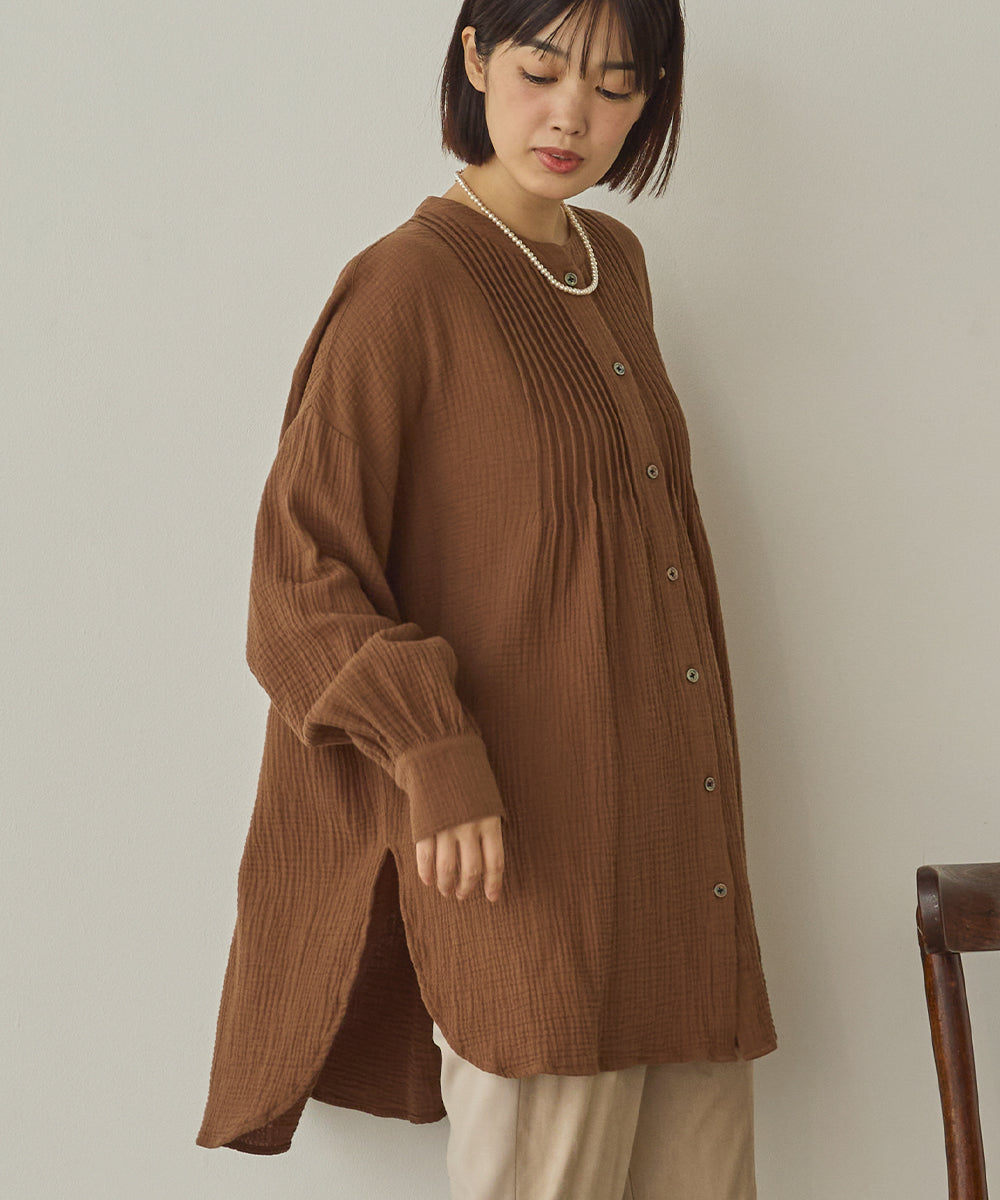洗い加工を施したダブルガーゼ生地を使用し、柔らかな肌触りとナチュラルな風合いが 魅力のタックシャツ。