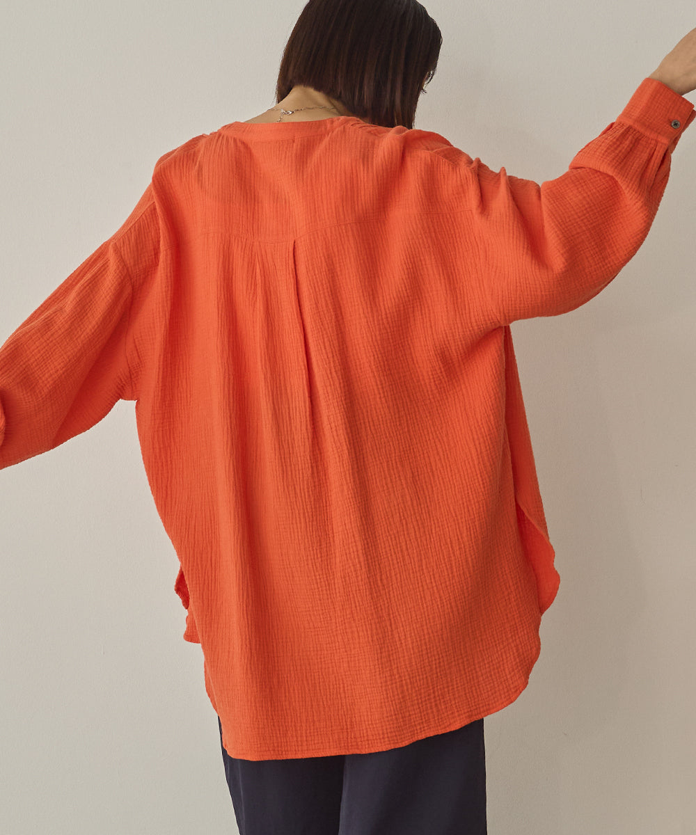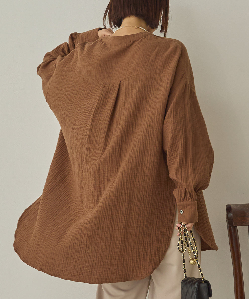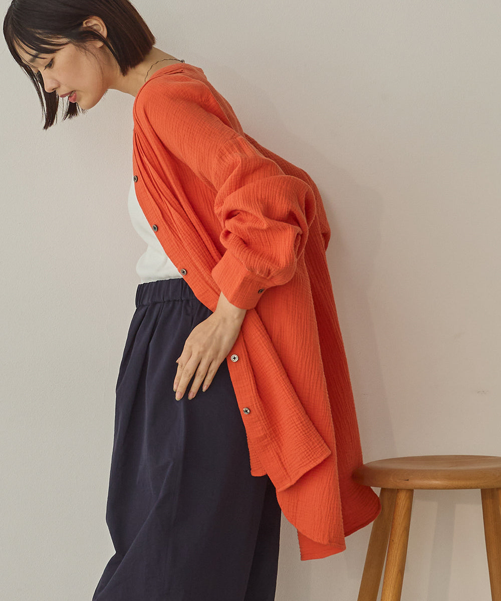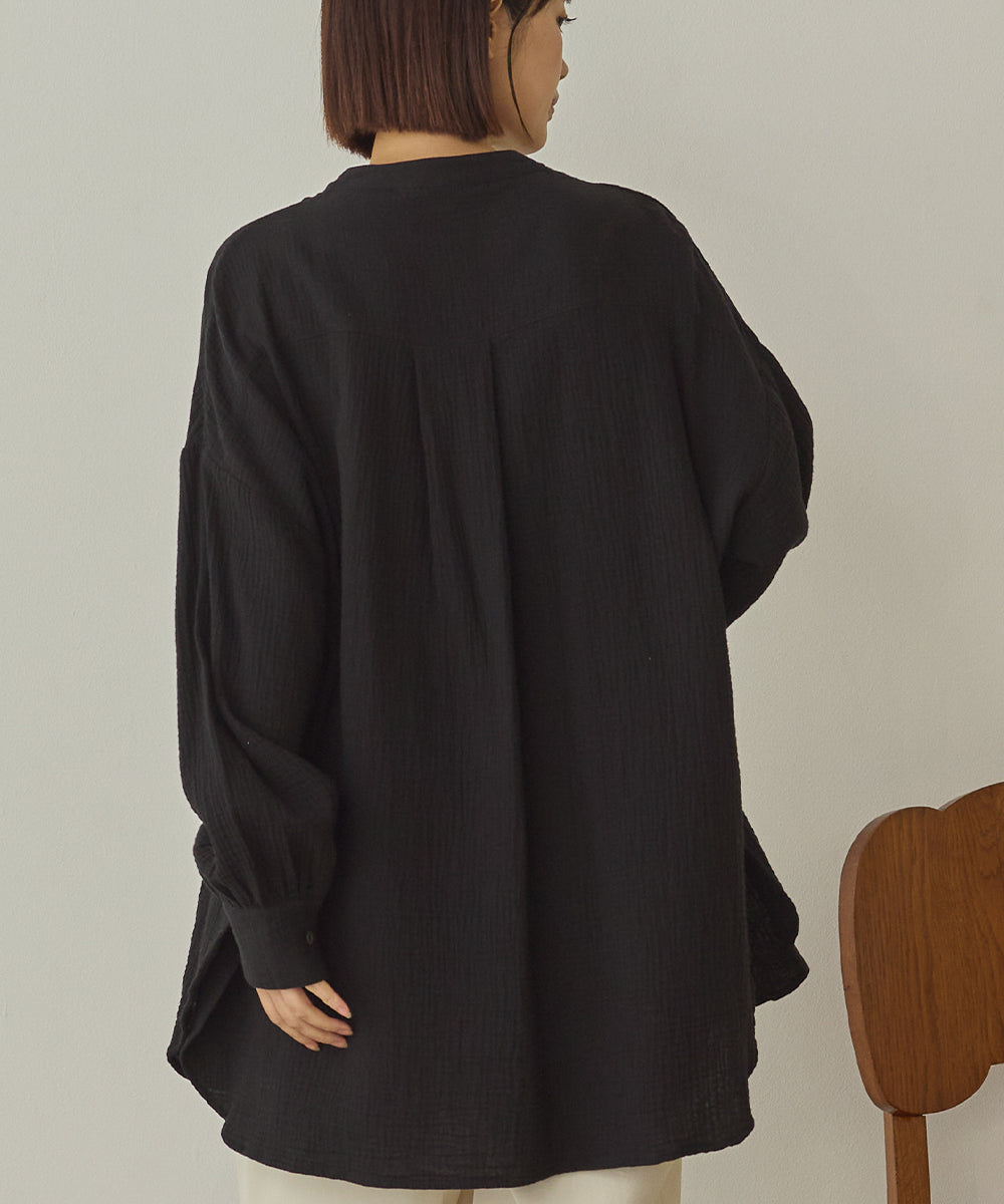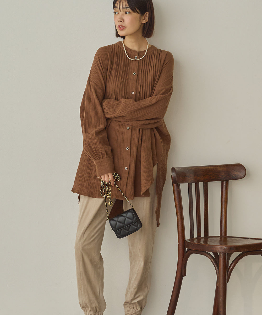 洗い加工を施したダブルガーゼ生地を使用し、柔らかな肌触りとナチュラルな風合いが 魅力のタックシャツ。