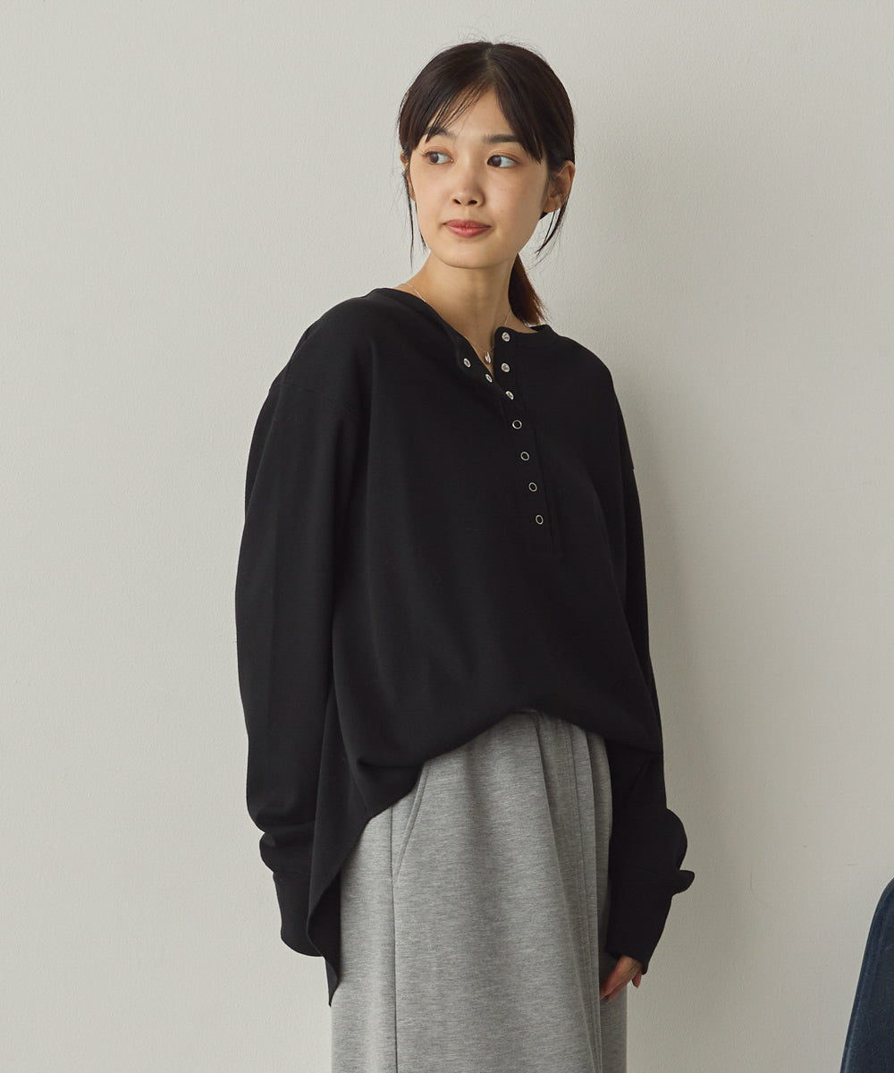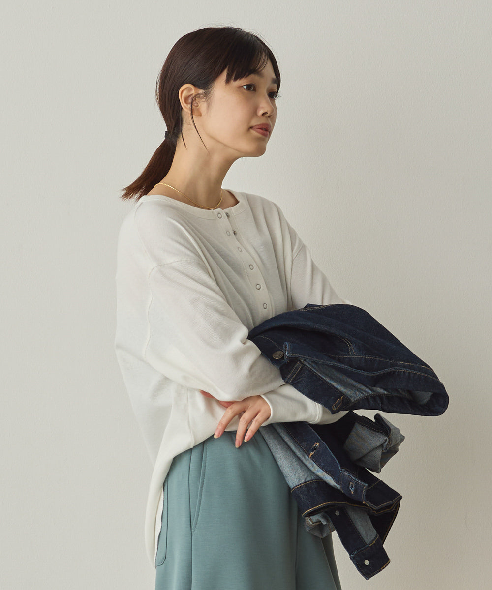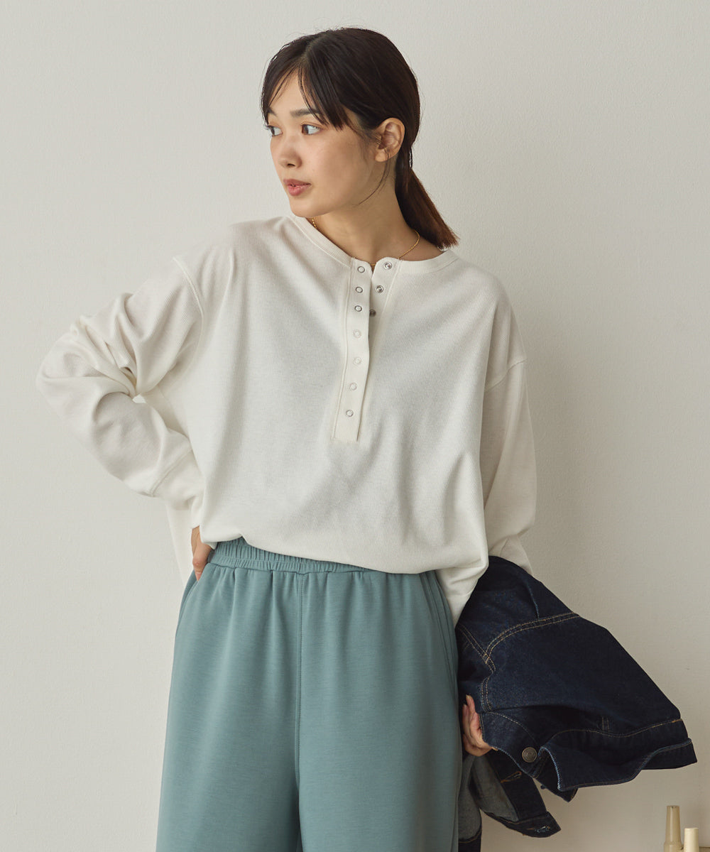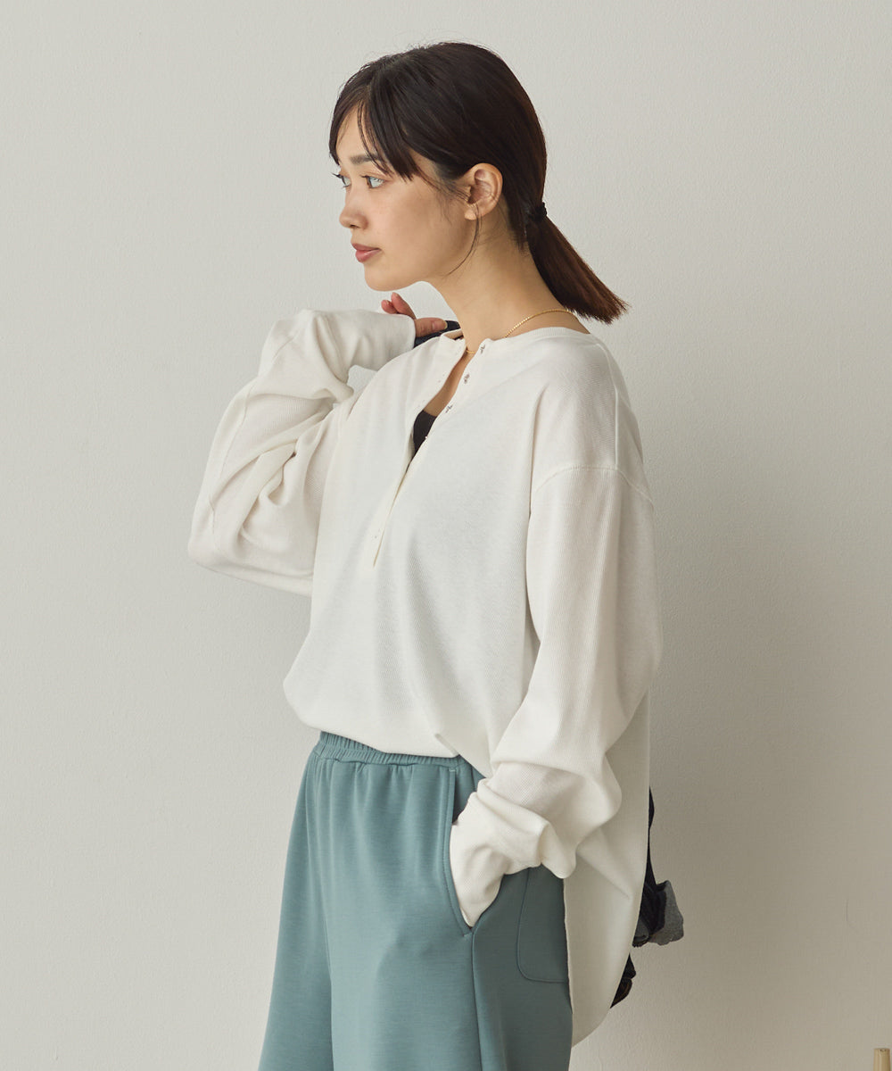 程よい厚みのストレッチリブ素材を使用したヘンリーネックプルオーバー。