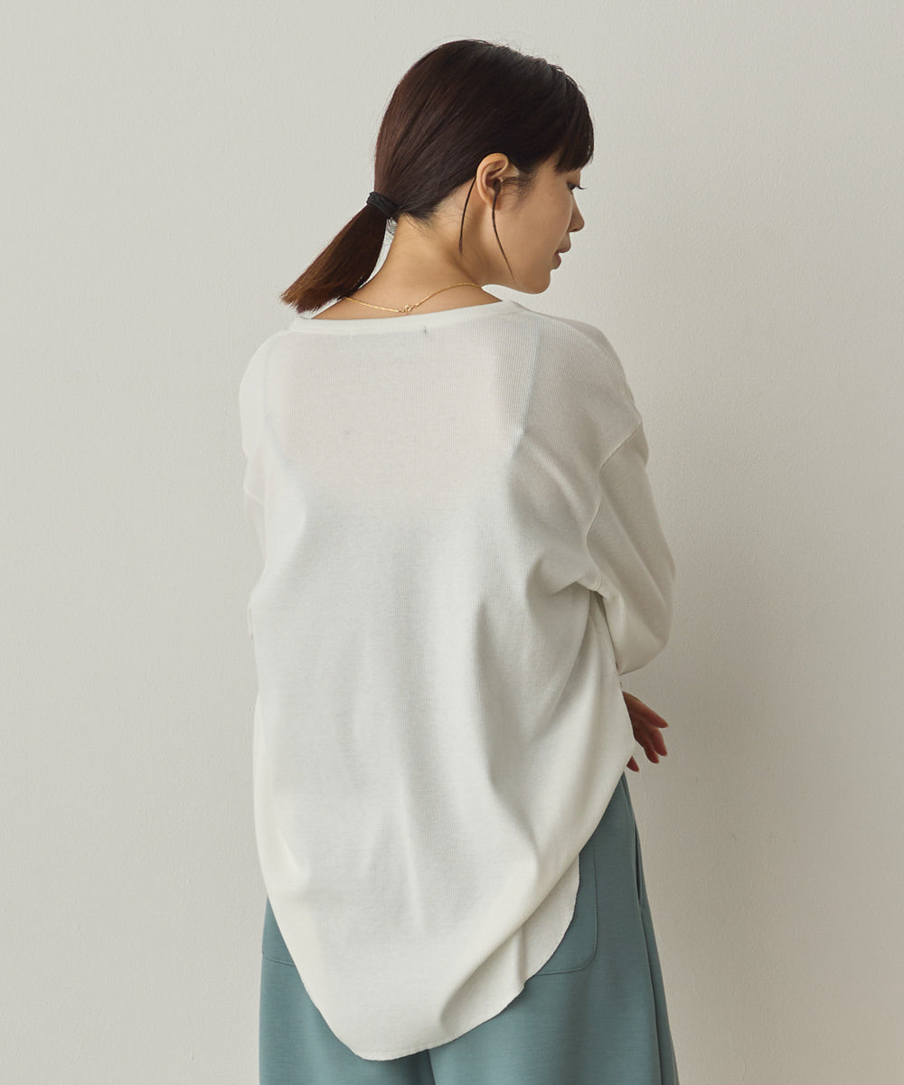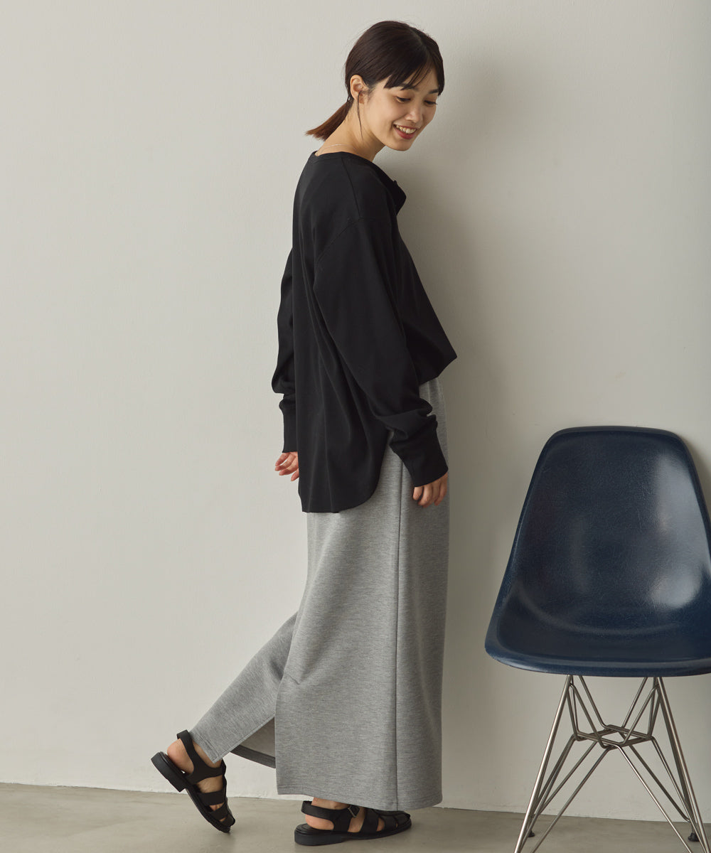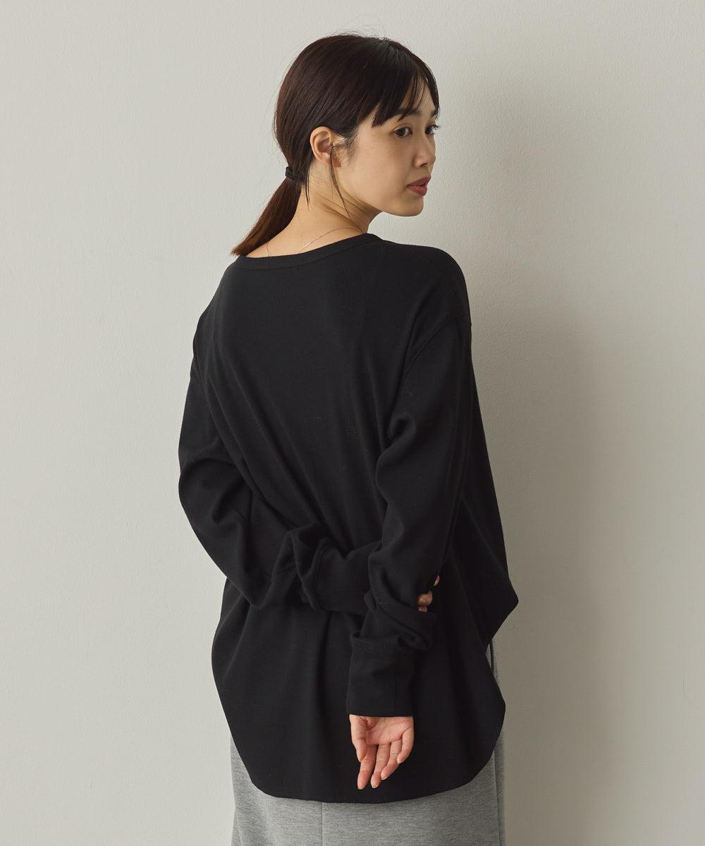 伸縮性があり着心地抜群で、重ね着はもちろん1枚でもサマになる優秀トップスです。