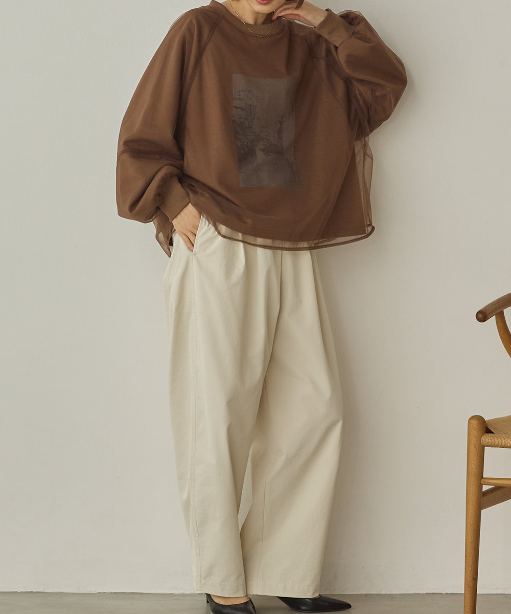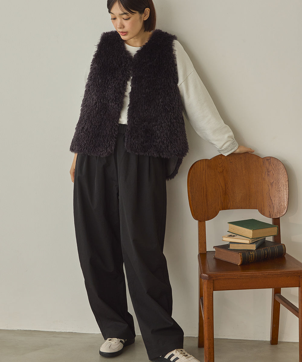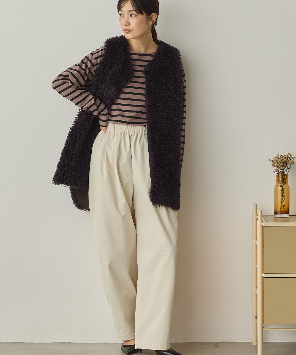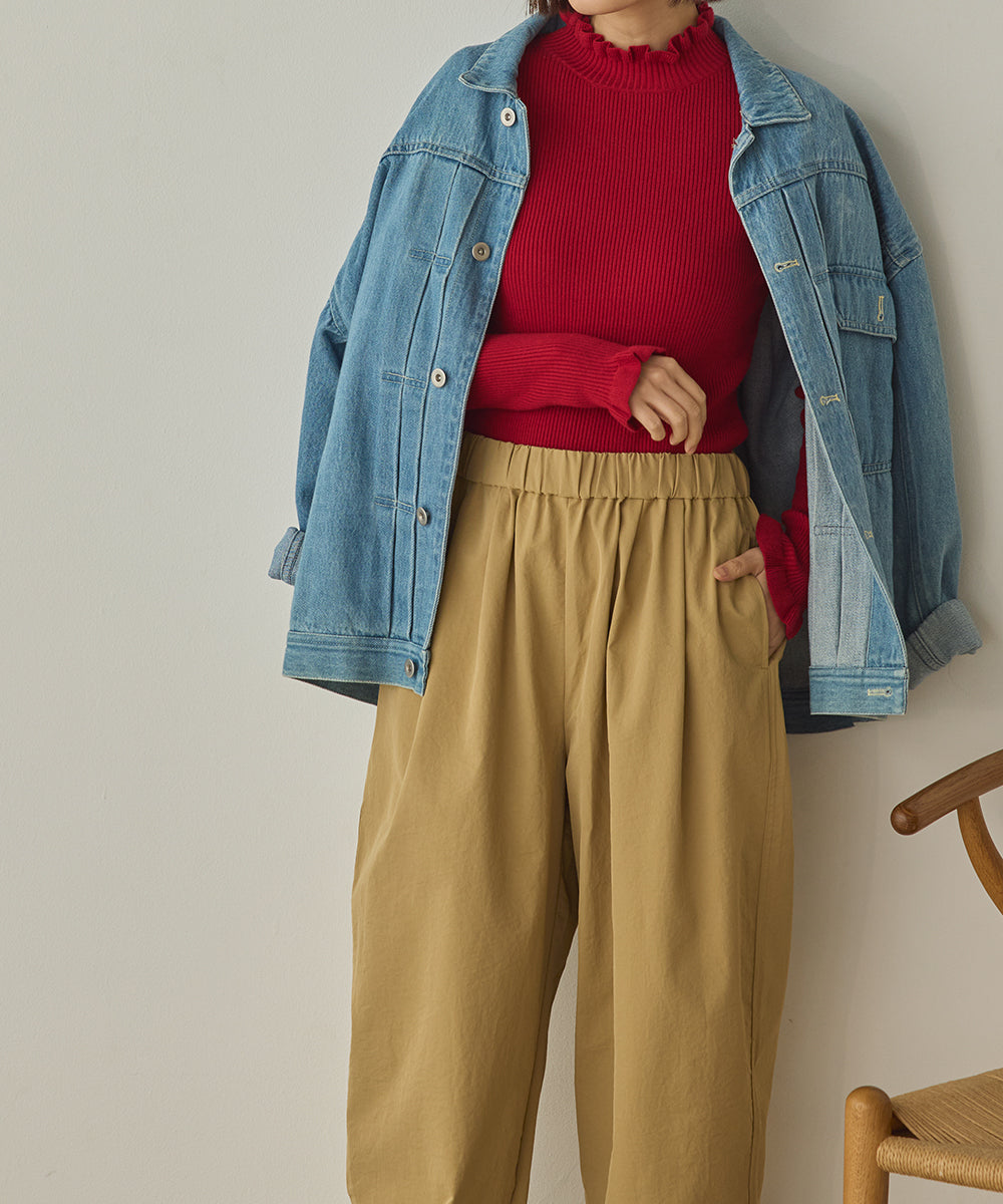 シンプルながら表情のある生地感が魅力で、カジュアルすぎず、ちょっときれいめな大人カジュアルスタイルを演出。