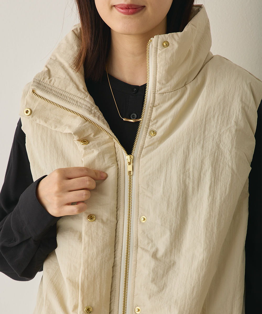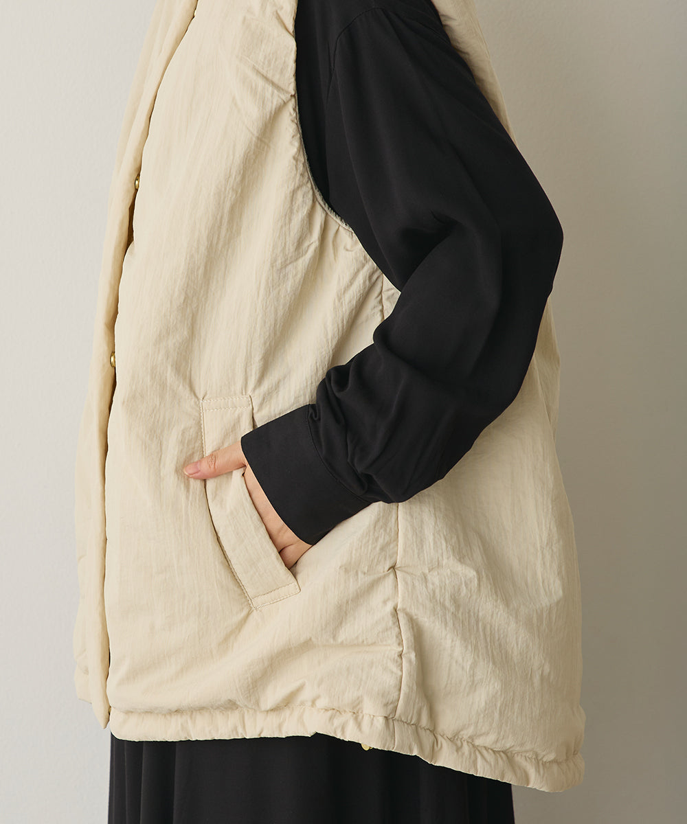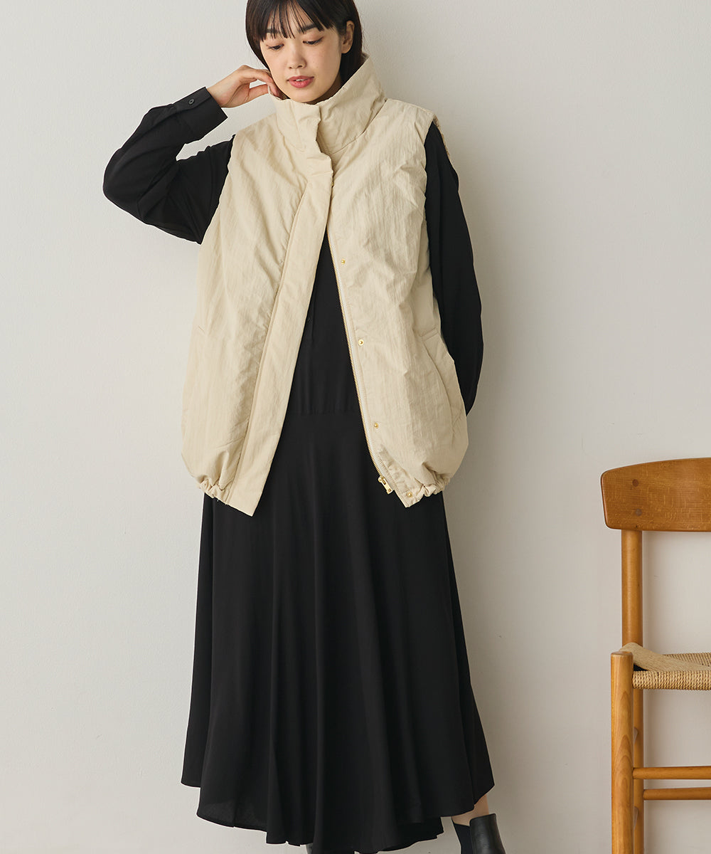 ノースリーブ仕様だから動きやすさも抜群。 厚手のニットやスウェットの上からも羽織りやすく、 レイヤードスタイルを軽やかに仕上げてくれます。