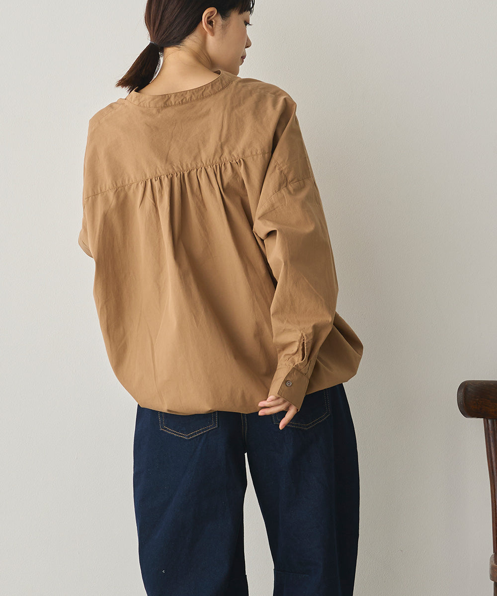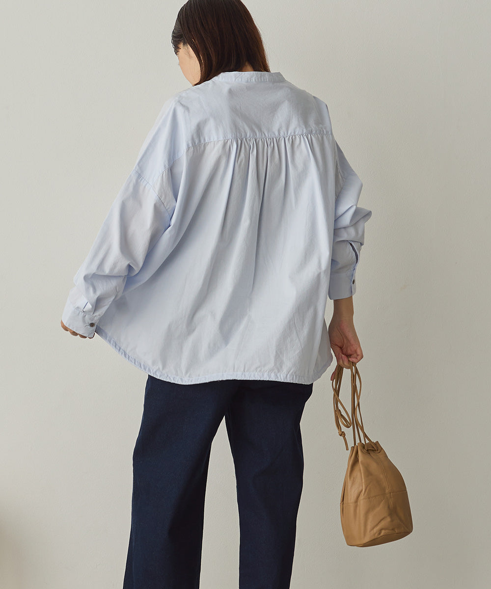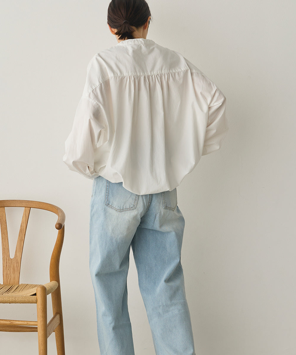 バンドカラーで顔まわりをすっきり見せ、後ろにはたっぷりギャザーを施した上品シルエット。