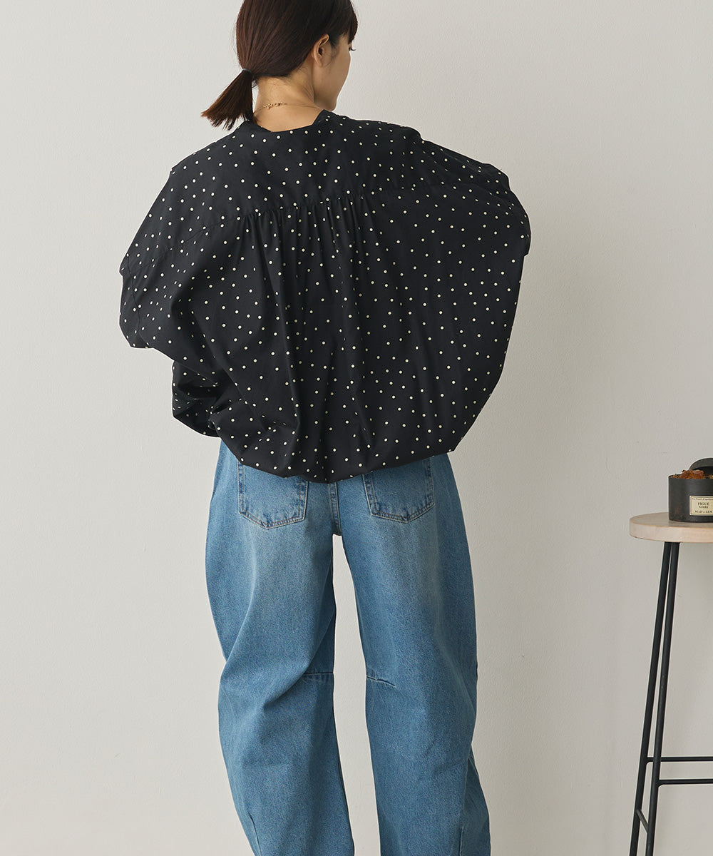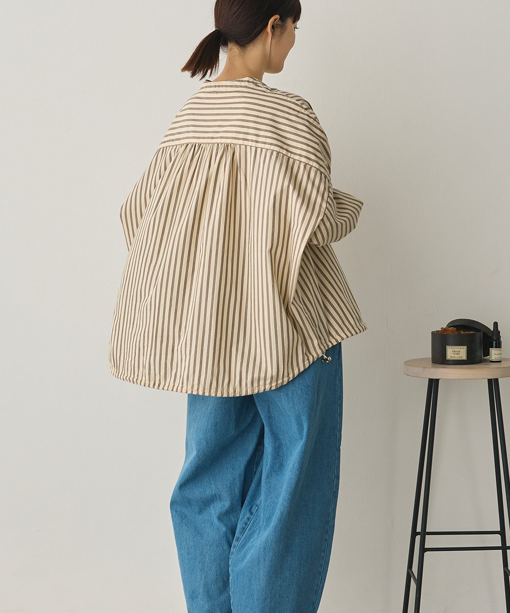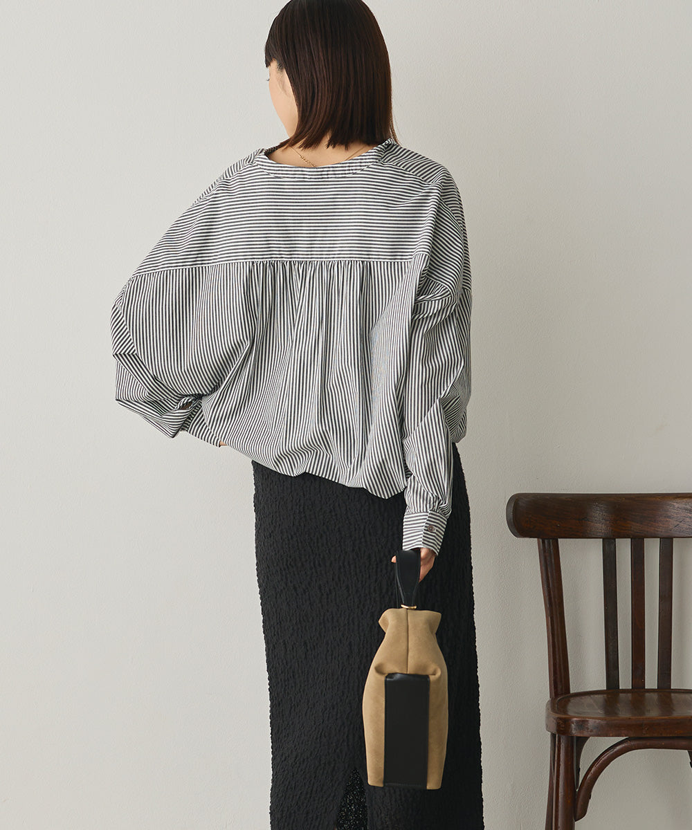バンドカラーで顔まわりをすっきり見せ、後ろにはたっぷりギャザーを施した上品シルエット。