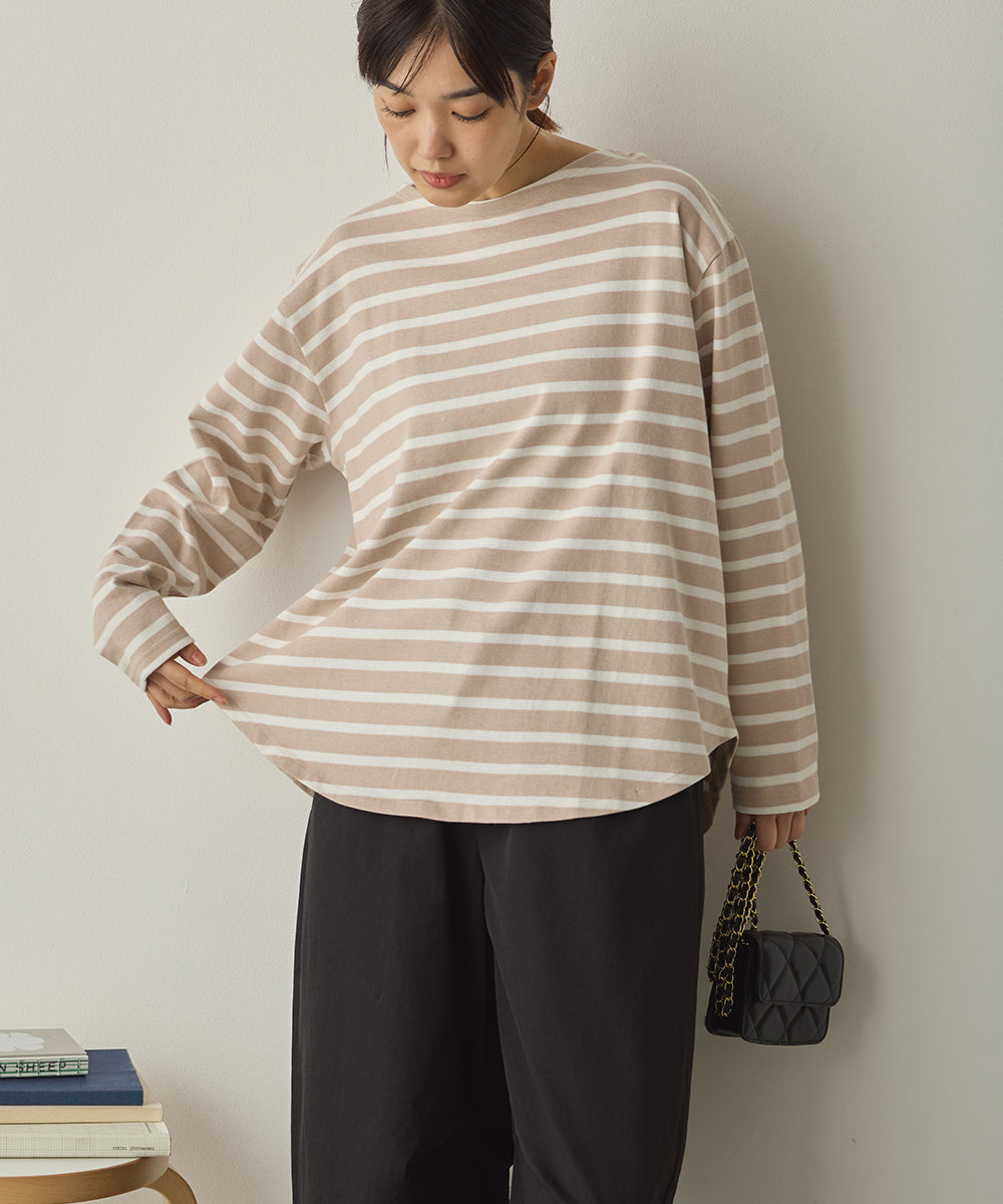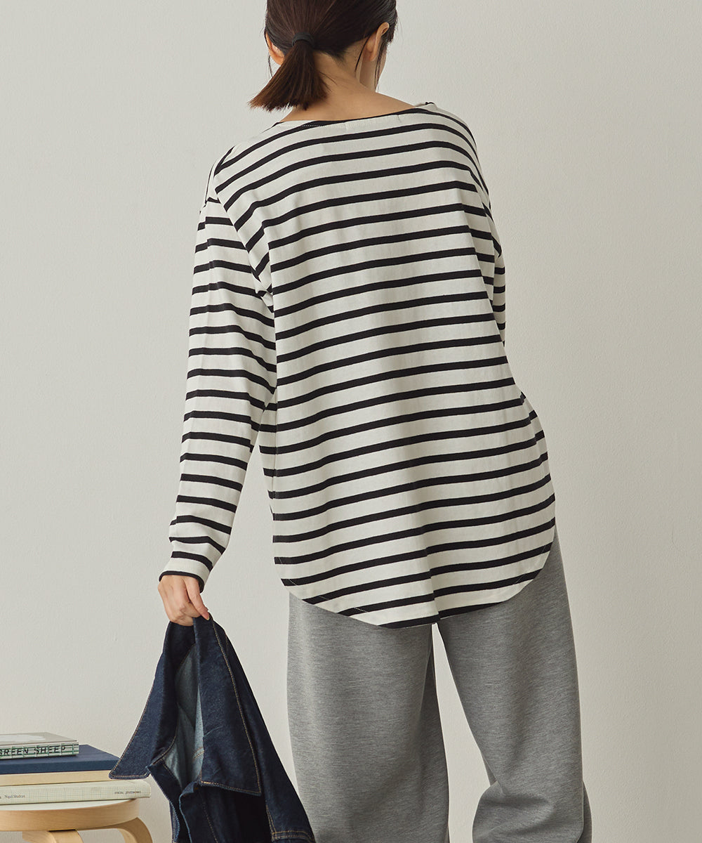 10番単ボーダー裾ラウンド長袖Tシャツ[1325-6139]