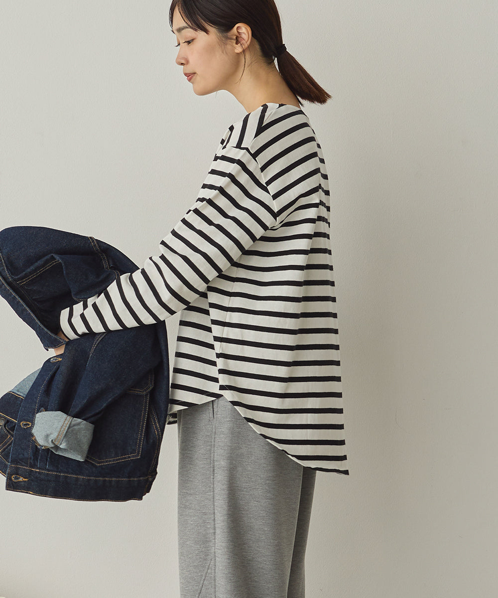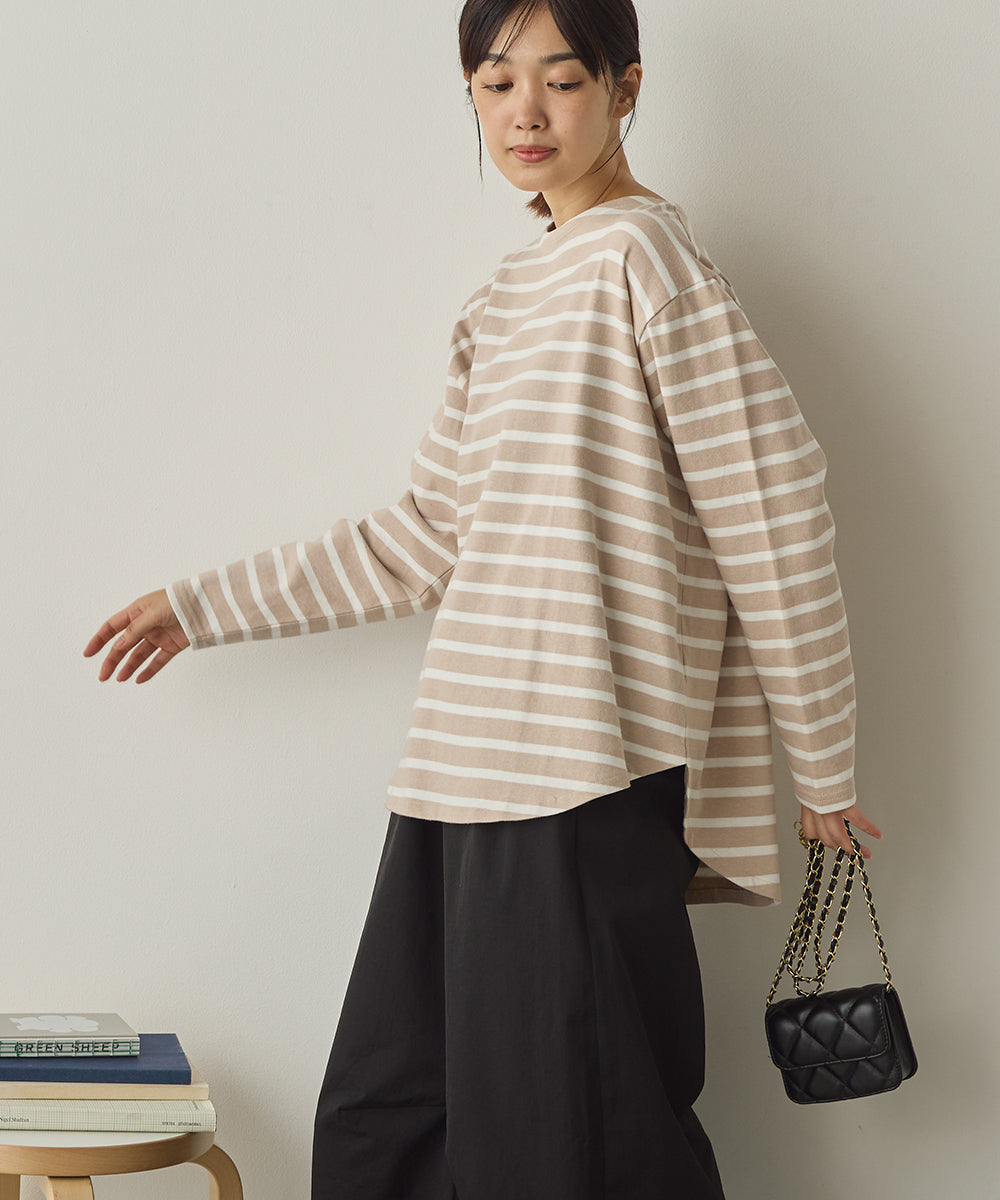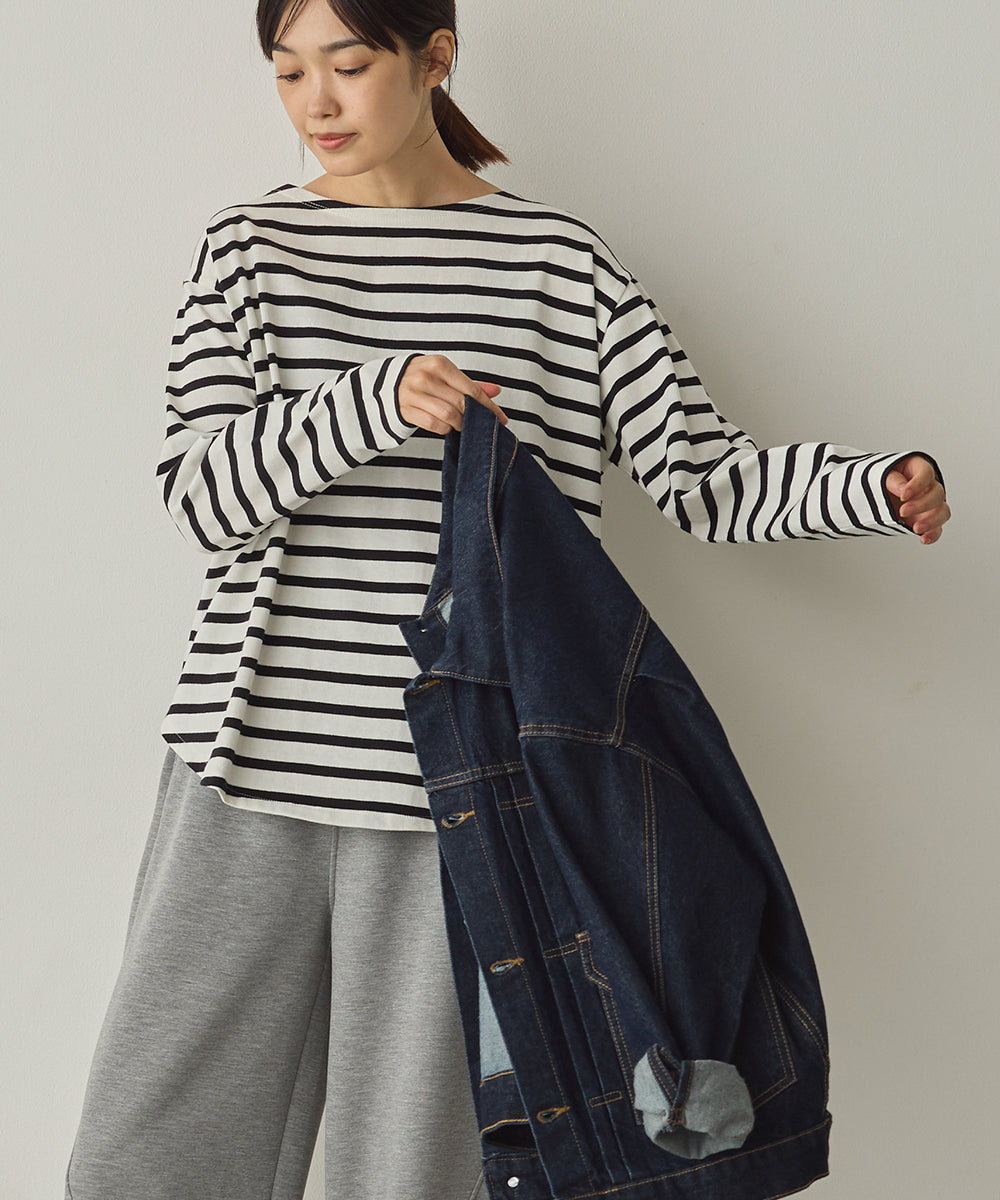 ベーシックなボーダーデザインはカジュアルながらも上品さがあり、デニムやスカート、ワイドパンツともバランス良く合わせられる万能アイテム。